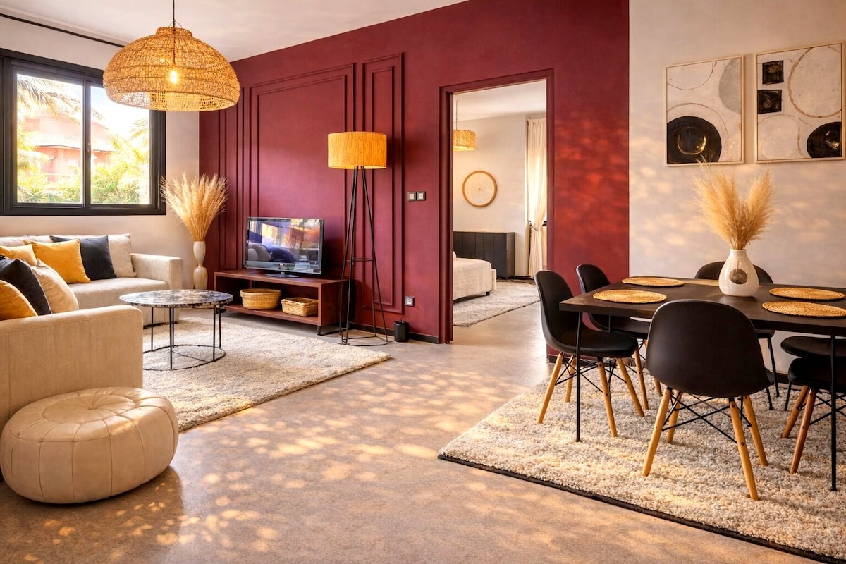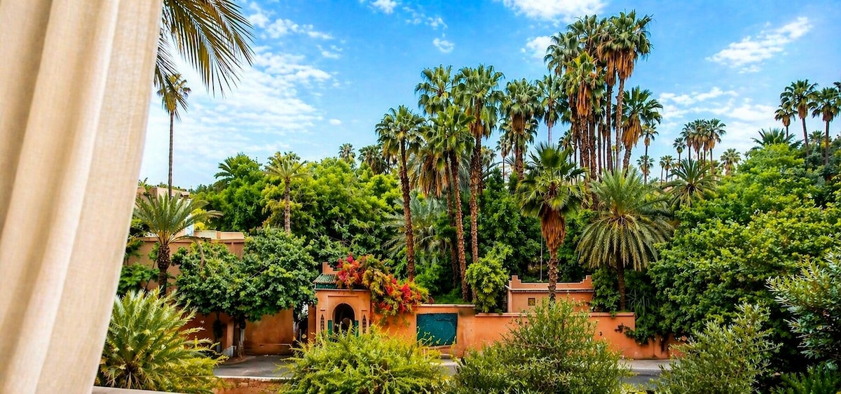 Jardin Majorelle'in doğrudan manzarası 🌿 Aydınlık, 80 metrekarelik bir daire, Yves Saint Laurent yaya caddesinde, son derece sakin. 2 yatak odası, birinci sınıf yatak takımları, hızlı kablosuz internet bağlantısı, 7/24 kendi kendine giriş. Konumu olağanüstü, her şey yürüme mesafesinde. Sınırlı sayıda uygun yer var. Hemen rezervasyon yapın.