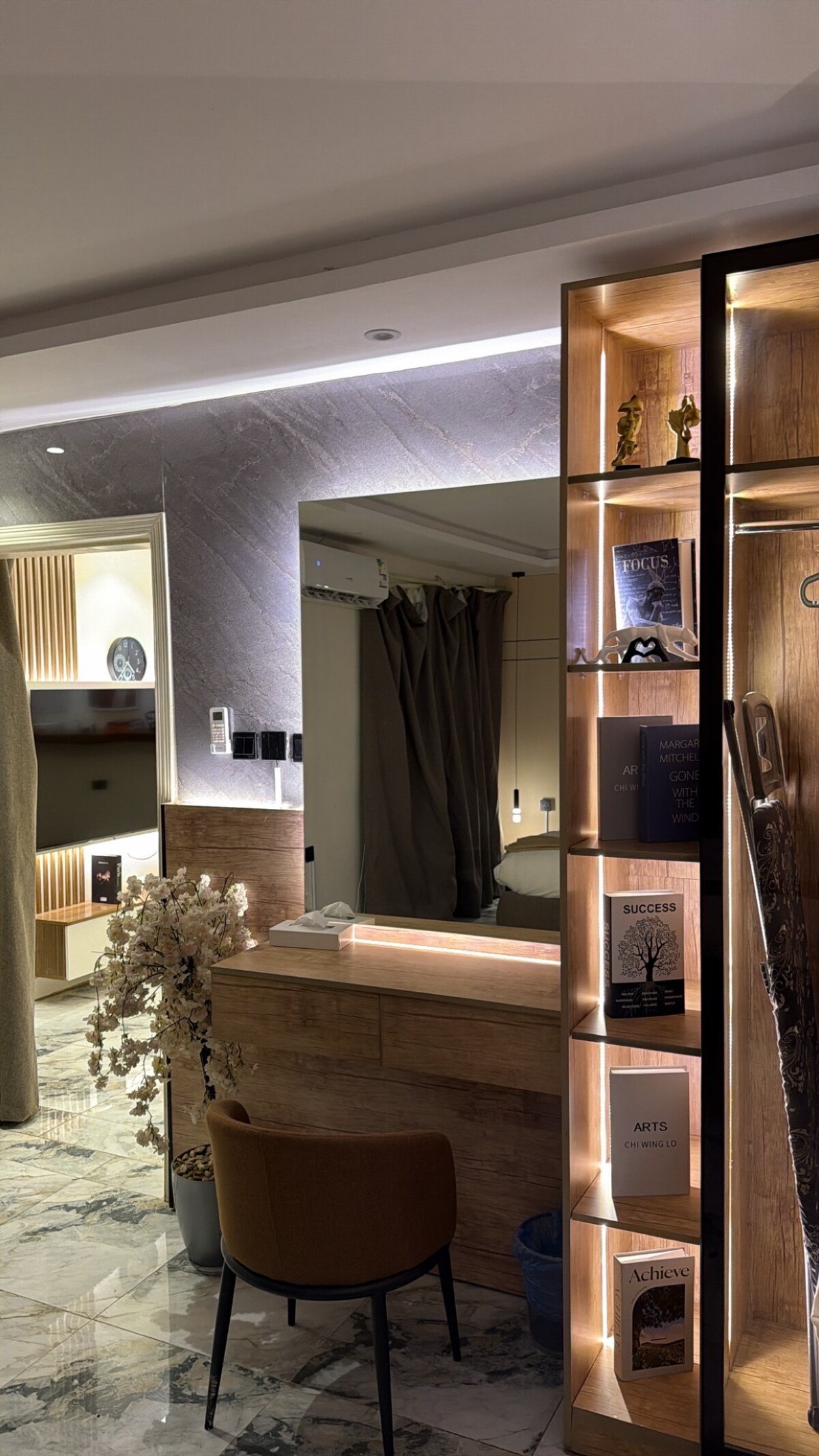 Hateen'de lüks daire, akıllı erişim ve duvarlar için uygun yalıtım ile kapılar ve zeminler için tam ses yalıtımı, binanın üçüncü katında ve Riyad'ın kuzeyinde ayrıcalıklı bir konumda, Bulvar'a 5 dakika yürüme mesafesindedir. Dairede yüksek kaliteli şilteli ve ekstra konfor için ek bir keçe katmanı bulunan king boy yatak, yüksek çözünürlüklü 65 inç ekran, yüksek hızlı internet, tam donanımlı bir mutfak ve argan yağı özlü yüksek kaliteli banyo ürünleriyle dolu bir banyo bulunmaktadır ve en ince ayrıntıların temizliğine özen gösterilmektedir.