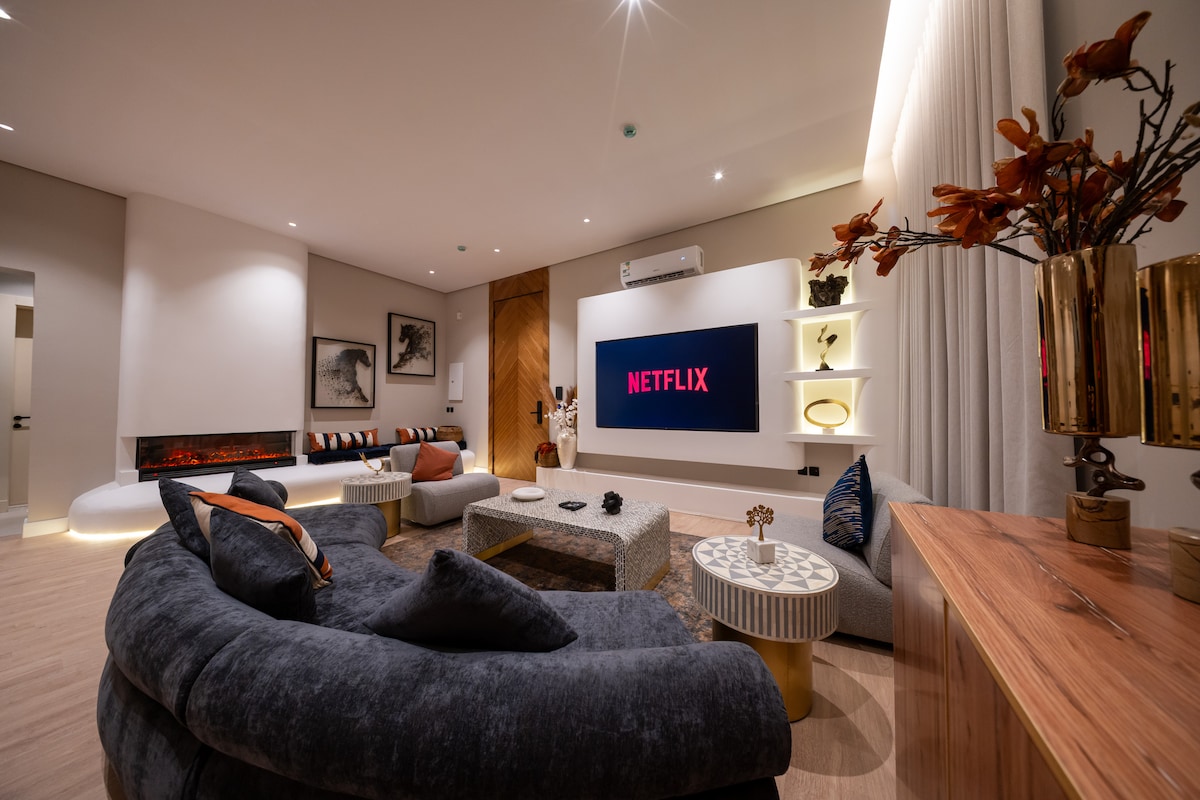 Riyad'ın en iyi semtlerinden birinde, KAFD'nin büyüleyici manzarasına sahip, olağanüstü bir konaklama için tasarlanmış modern bir daire. Keyifli akşamlar için ekran ve projektör bulunan bir açık hava oturma alanına sahiptir. Konforunuz için yatakta yüksek kaliteli 14 cm ekstra katman bulunmaktadır. “Ayrıca, unutulmaz bir deneyim sağlamak için önceden rezervasyon yaparak ek bir ücret karşılığında özel günler için etkinlik koordinasyon hizmetleri (pasta ve aksesuarlar dahil) sunuyoruz.”