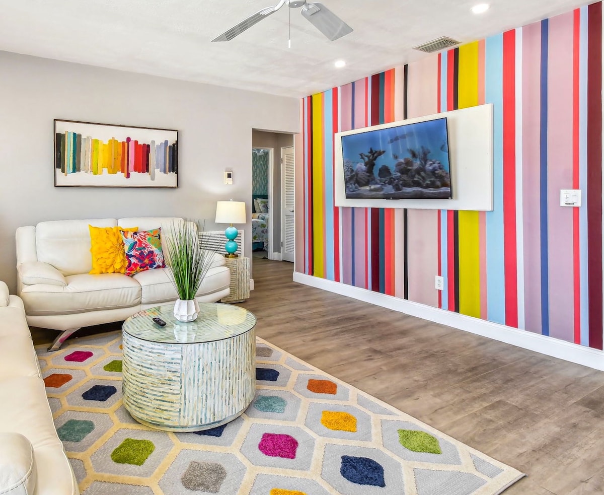 A beautiful, colorful 4BR/2Bath home sleeps 12 guests and features 2 outdoor entertainment spaces with outdoor dining and 2 outside TVs! Saltwater pool, fire pit, cabana, and expansive outdoor living area with 2 TVs. The pink poolside guest bungalow is a favorite highlight! Located just 6 minutes from beautiful beaches and 22 minutes to downtown St. Pete, this home offers the best of both worlds. Optional heated pool available for an additional cost.