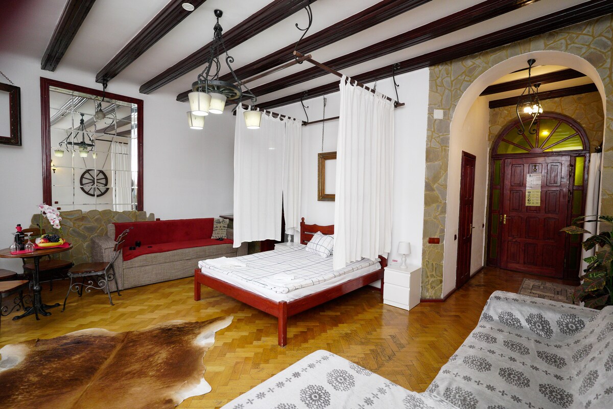 Benzersiz huzurlu ve sessiz bir semtte, restore edilmiş tarihi bir evde tatilinizin keyfini çıkarın Nikolas Haus, özellikle ünlü Schei bölgesinde, eski Brasov şehrinde bulunmaktadır. Daha erken bir romantizm, gizem ve entrika zamanına geri dönen Nikolas Haus hayal gücünüzü harekete geçirecek. Mimari eski, muhteşem bir şekilde restore edilmiş ve büyüleyici, tasarım ve dekor yeni, taze ve lüks. Bu denge Nikolas Haus'u bu kadar eşsiz kılan şeydir.