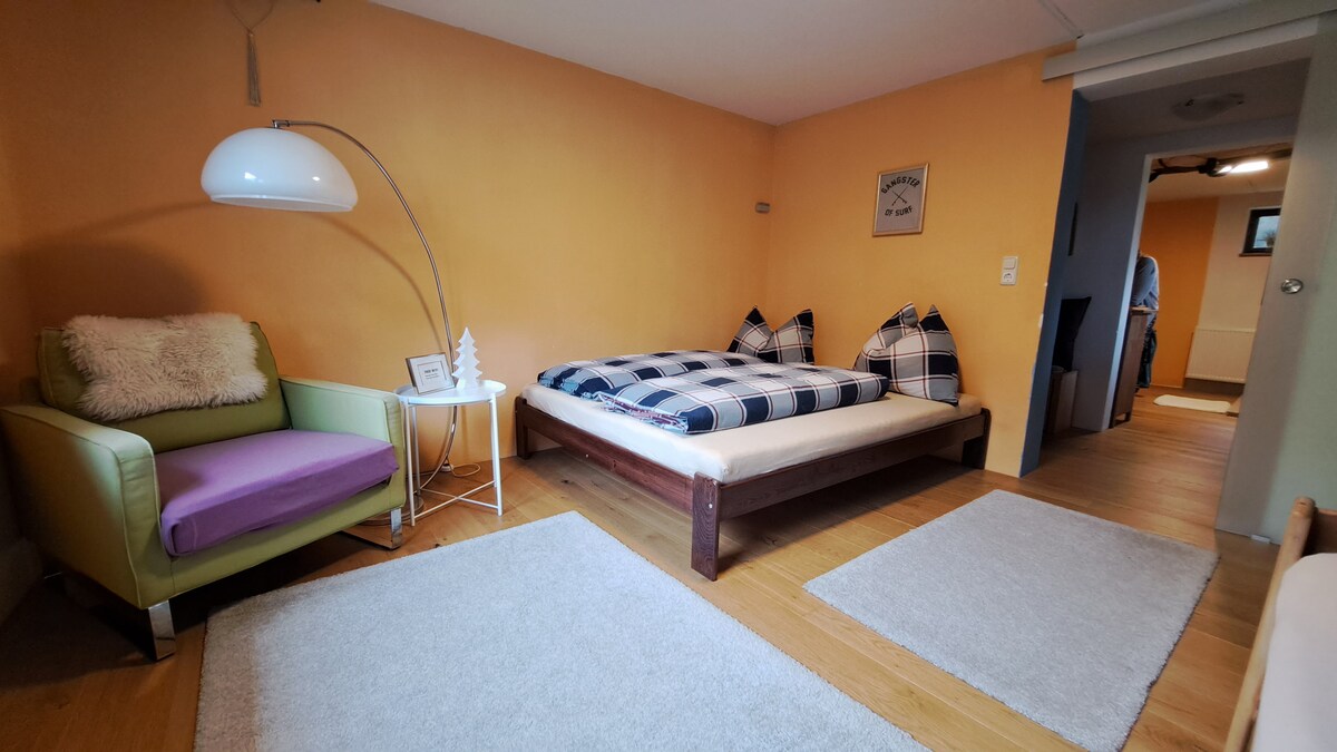 Unsere Ferienwohnung bietet Platz für bis zu vier Personen und verfügt über ein Schlafzimmer und eine Wohnküche. Eine ausziehbare Couch, ein Smart TV und W-Lan sind ebenfalls vorhanden. Zudem gibt es ein separates Badezimmer mit Dusche und WC. Die Terrasse sowie der kleine Garten laden zum Entspannen und Verweilen ein. Zusätzlich gibt es ein beheiztes Kellerabteil. Ein Carport steht für die sichere Parkmöglichkeit deines Autos zur Verfügung.