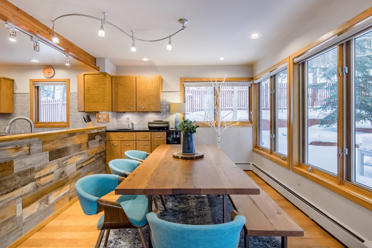 House of the Morning Sun is our little piece of heaven that we are happy to share with you! Featured on HGTV's remodel competition show "Battle on the Mountain" in 2024, this classic Chalet-style mountain home is smartly decorated in mountain-contemporary style. Bordering the national forest, our home is only two miles from Main Street Breckenridge. You’ll love it because of the light, the kitchen, the comfy beds, the high ceilings, wood-burning fireplace, brand new hot tub, and the views!