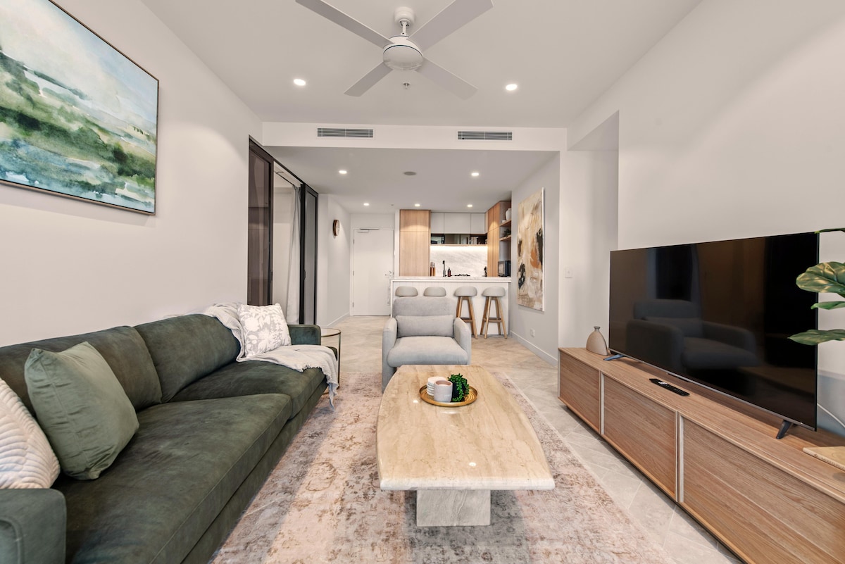 New Queen's Wharf'ta şehrin üzerinde uçun ve huzurlu, gökyüzüne uzanan lüksün keyfini çıkarın. 59. katta yer alan bu güzel, yepyeni küratörlü daire, doğadan ilham alan sakinleştirici iç mekanları Brisbane'in siluetinin, nehrinin ve dağlarının dudak uçuklatan, kesintisiz manzaralarıyla birleştiriyor. İster iş için ister romantik bir kaçamak için ister şehrin göbeğinde huzurlu bir kaçamak için burada olun, yumuşak toprak tonlarının, doğal dokuların ve lüks kaplamaların mükemmel bir inziva oluşturduğu sakin bir alana adım atın.