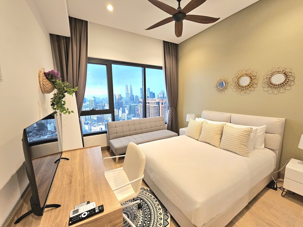 Bu 1 yatak odalı daire, nefes kesici KL silüet manzarasına sahiptir. 3 kişilik kanepeli oturma odası, yemek masası, mutfak, masa ve KL Kulesi ve Petronas İkiz Kulelerine bakan büyük bir balkonu vardır. 55 inç TV, yüksek hızlı kablosuz internet bağlantısı ve rahatça sığabileceğiniz queen boy yatak bulunmaktadır. *Bu çift anahtarlı dairenin diğer ünitesi, queen boy yatak, kiler, tuvalet ve banyolu kompakt bir stüdyodur. Sizinle birlikte seyahat eden arkadaşlarınızı mahremiyet içinde barındırabilir. Daha fazla bilgi istemekten çekinmeyin!