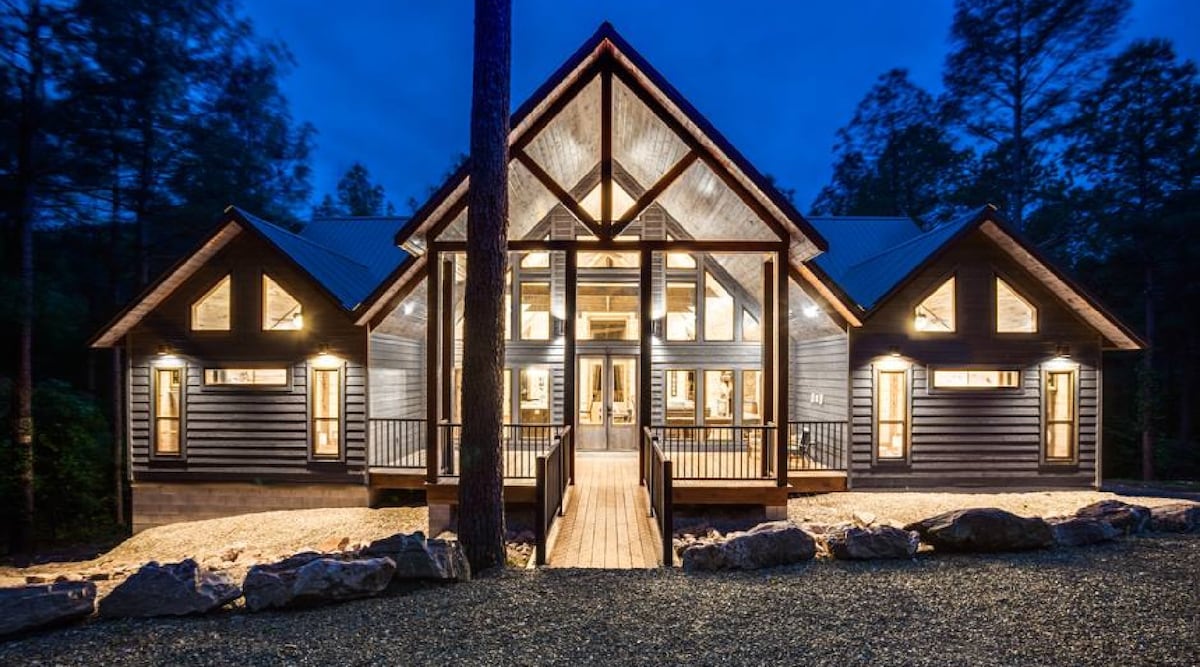 GORGEOUS black modern cabin, luxury amenities. Sucluded location! Sleeps 2 to 14. 3 king rooms, 3.5 baths, an open bunk/game room with 3 stacked bunk beds, open loft bed w/full bed and a full size floor mattress.We personally manage our cabin which means LOWER rates! Situated in the Ouchita Forest with gorgeous mountain and sunset views! Close to Hochatown and short drive to Broken Bow Lake/Beavers Bend State Park.Hot tub, arcade, fire pit, swings, etc.Easy getaway from DFW. Dog friendly max 2