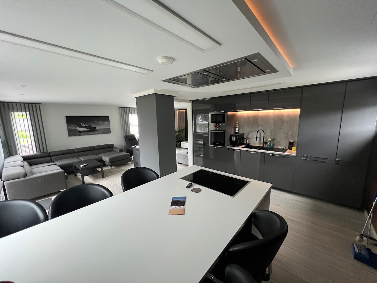 Deniz kenarında modern ev – 190 m² Bu modern evde yerden ısıtma, elektrikli araç şarj cihazı, hızlı kablosuz internet bağlantısı ve rahat bir konaklama için ihtiyacınız olan her şey bulunmaktadır. Dört yatak odası (beşi çatı katında), banyosu, iki ek tuvaleti ve geniş bir yerleşimi vardır. En yakın mağazalara sadece 800 m, şehir merkezine 3 km mesafededir. Güneşli arsa, rüzgar ve meraklı gözlerden korunaklı noktalar sunuyor. Sessiz bir çıkmaz sokakta, trafiğin olmadığı, aile dostu bir semtte yer alıyor.