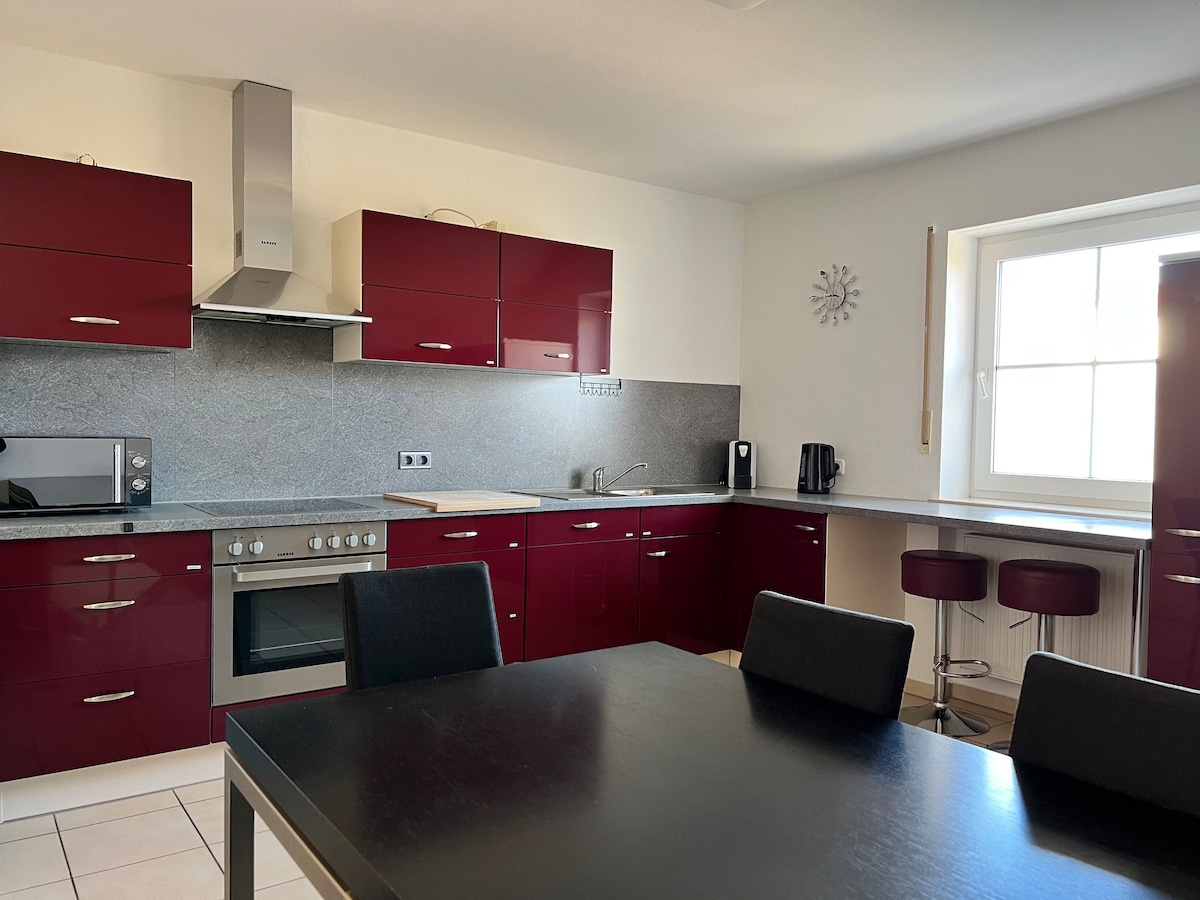 Huzurlu bir konumda geniş birinci kat dairesi (yaklaşık 130 metrekare). Kapalı oturma alanı, küçük güneşlenme terası ve rahat donanımlı mutfağı olan ayrı giriş. Dairede kablosuz internet bağlantısı, uydu TV, merkezi ısıtma, çamaşır makinesi ve ücretsiz otopark bulunmaktadır. Bisiklet ve motosikletler için depolama olanakları da mevcuttur (önceden düzenleme gerekir). McDonalds, fırın ve süpermarketler (REWE, V-Markt) sadece 500 metre uzaklıkta ve yürüme mesafesinde.