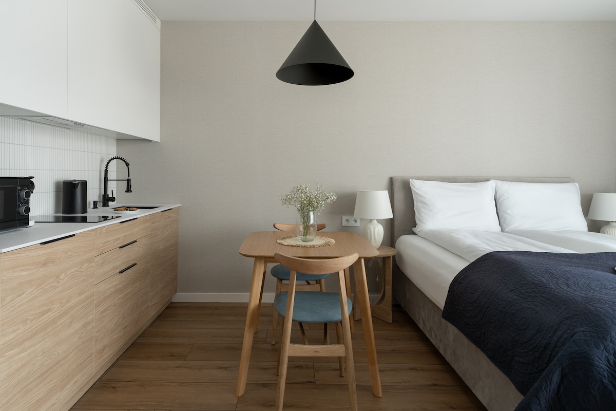 Daire, birlikte unutulmaz anlar geçirmek isteyen çiftler için mükemmel bir atmosfer yaratmak üzere tasarlanmıştır. 32 m²'lik mekân, sıcak bej tonları ve ışığı artıran zarif bir şekilde yerleştirilmiş aynalarla rahat ve romantik bir ortam yaratır.