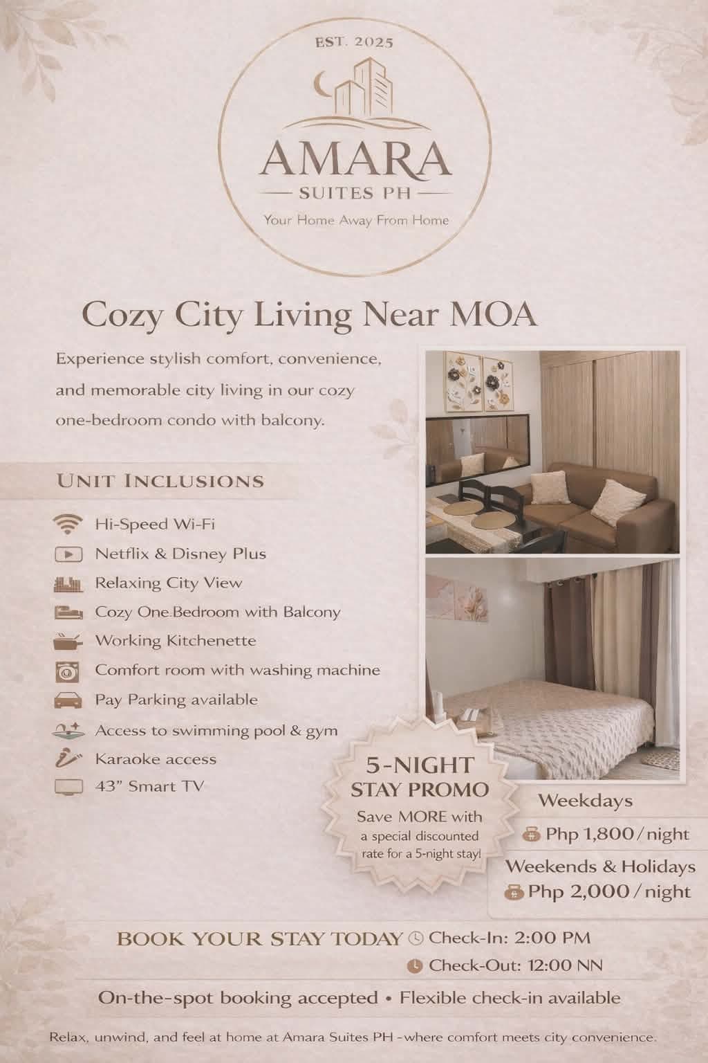 Maui Tower Azure Urban Residences & Resort'ta bulunan tamamen yenilenmiş modern site içi dairemize hoş geldiniz. Bu 50 metrekarelik dairede bir balkon vardır ve 6 misafire kadar konaklama sunan 2 yatak odasına sahiptir. Ana yatak odasında✔ 1 çift kişilik yatak Misafirin yatak odasında tek çekyatlı✔ 1 çift kişilik yatak Oturma odasında✔ 1 kanepe (ikiz çift kişilik) yatak ✔ Xiaomi M8 Pro Classic Tv Konsolu, 2 kumanda + 20.000 çok oyunculu oyun ✔ Samsung Soundbar Hoparlör ✔ 43 inç HD akıllı TV ✔ Akıllı kilit girişi ✔ Karaoke