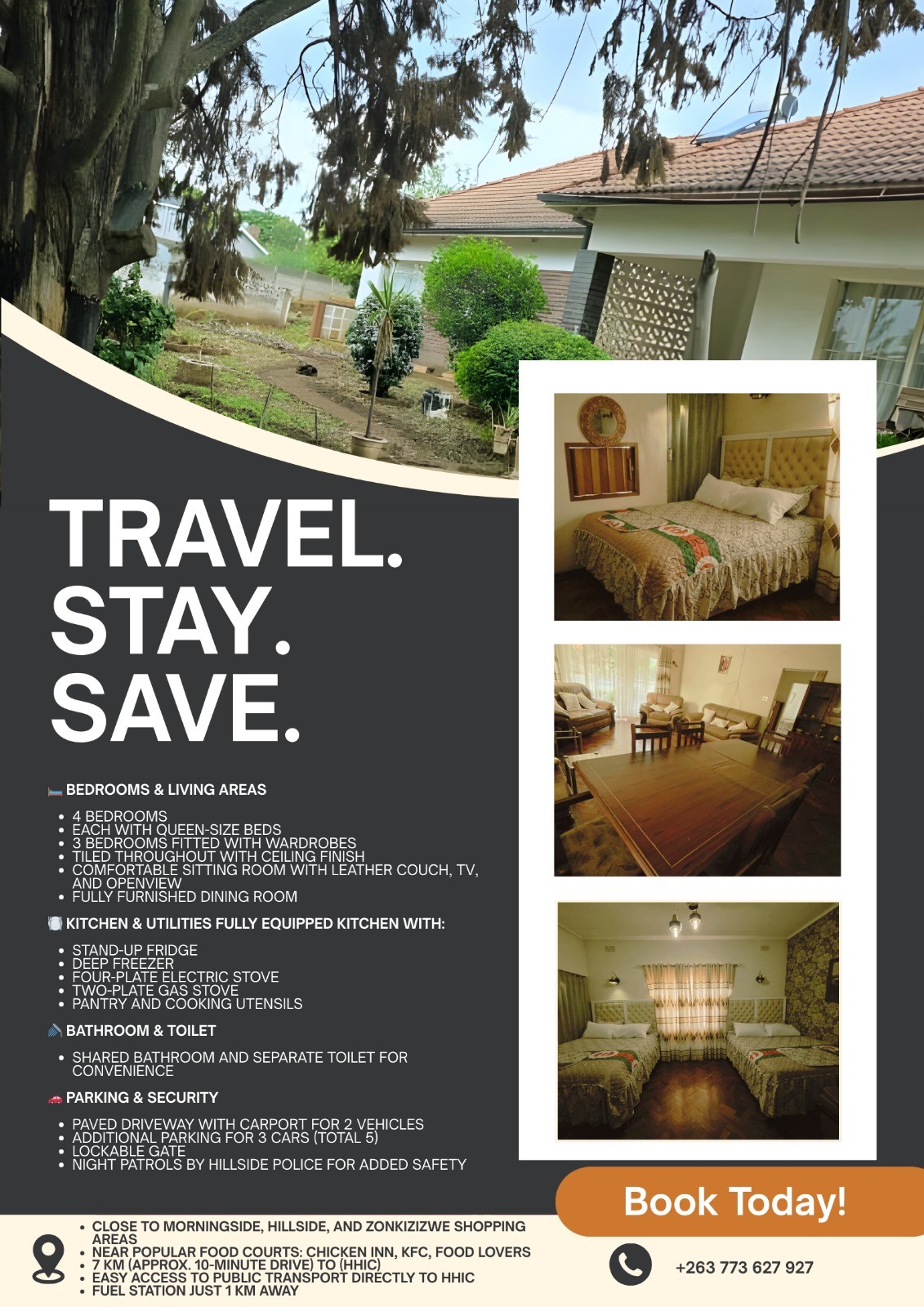 Bulawayo'nun en iyi yeri şehre çok yakındır ve yemyeşil bir bahçeye ve güvenli bir yaşam alanına sahiptir. Mekanımı dış mekan nedeniyle seveceksiniz. Çiftler, yalnız maceraperestler, iş için seyahat edenler ve aileler (çocuklu) için şiddetle önerilir. Elektrik kesintisi ve gaz sobası durumunda güneş ışıkları ve gayzerle donatılmıştır.