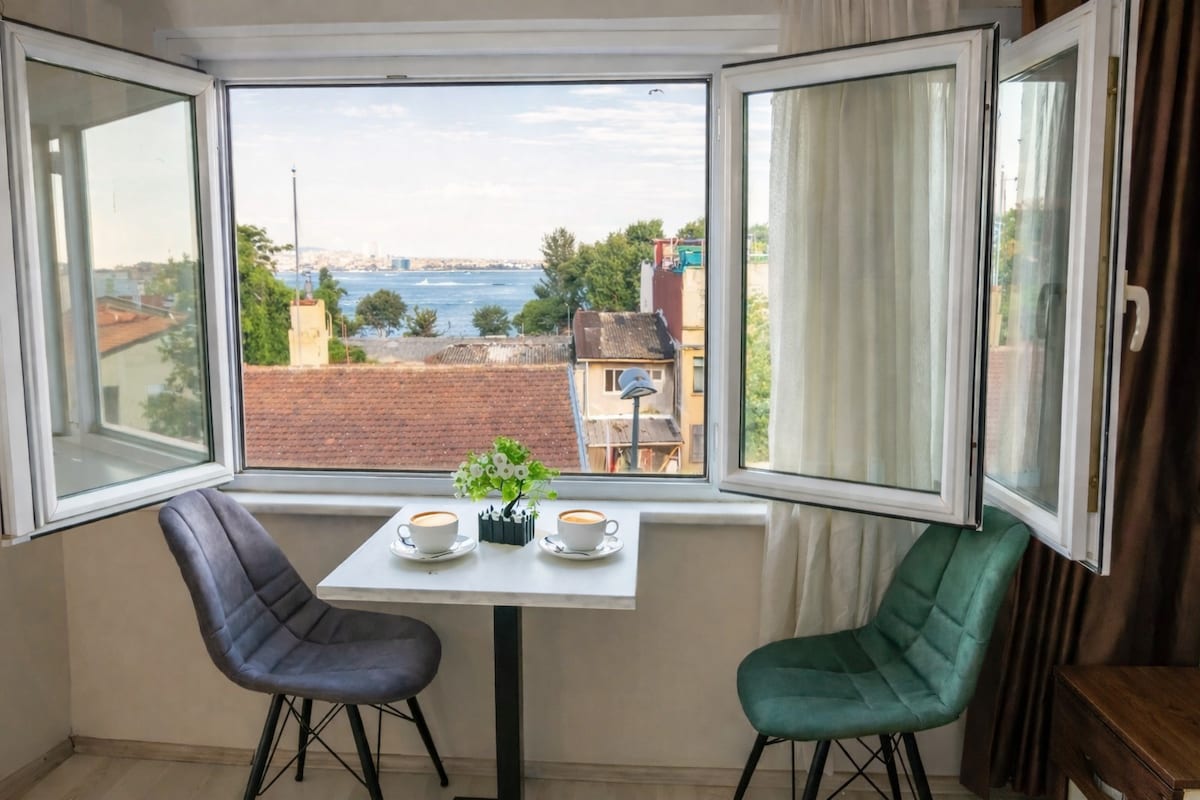 This extraordinary, stylish, spotless suite has a comfy sofa for rest, a high-quality bathroom, and an elevator in the great location in the Beyoğlu/Taksim district. Moreover, enjoy the magnificent panoramic view of Bosphorus (till Prince' Islands and Asian side) and Historical Peninsula (Topkapi Palace, Hagia Sophia, Süleymaniye Mosque, Galata Tower, along with other famous monuments) from its large private terrace with a big table.