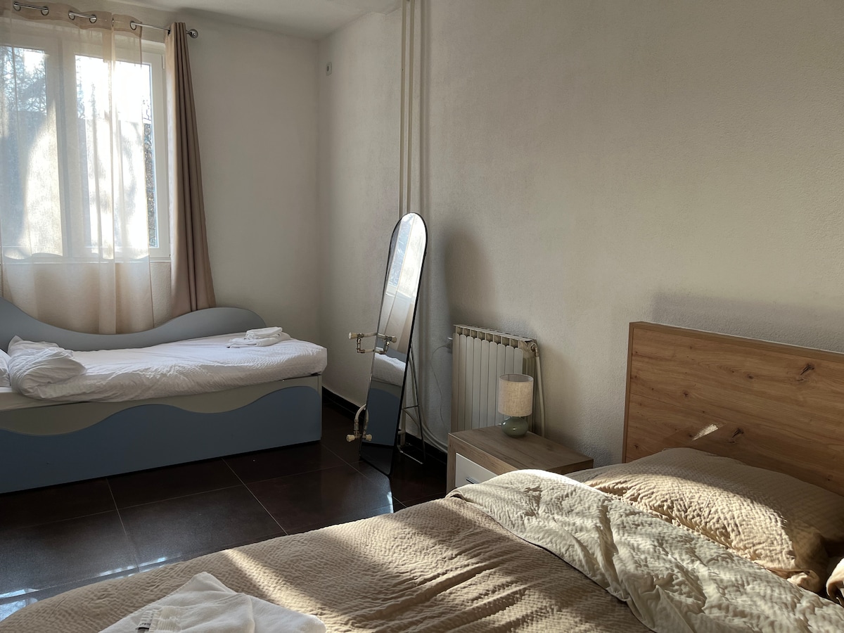 Sakin bir semtte, Üsküp City Mall ve Esgate Mall'a sadece 5 dakika, şehir merkezine 10 dakika mesafede huzurlu ve şık bir daire. Çiftler veya yalnız seyahat edenler için mükemmeldir. İki özel terasın, birinci sınıf yataklı rahat bir yatak odasının, tam donanımlı bir mutfağın, hızlı kablosuz internet bağlantısının, akıllı TV'nin ve klimanın keyfini çıkarın. 2. kattadır (asansör yoktur). Yakınlarda ücretsiz halka açık park yeri. Kısa veya uzun süreli konaklamalar için idealdir. Gizliliğin ve konforun keyfini çıkarırken kendinizi evinizde hissedin. Dimov Urban Stay'e hoş geldiniz!