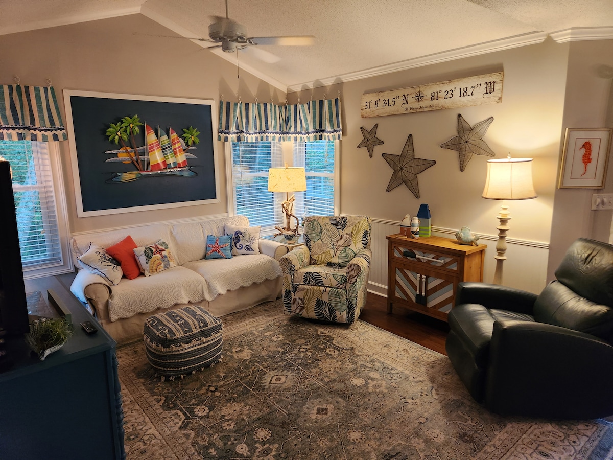Rahat St. Simons kasaba evimize hoş geldiniz! Göldeki kaplumbağaları izlerken verandada kahvenizin tadını çıkarın, ardından dışarı çıkın; plajlar, mağazalar ve restoranlar sadece 4 km uzaklıktadır. 3 konforlu yatak odası, geniş bir yaşam alanı ve tam donanımlı bir mutfak ile dinlendirici bir konaklama için ihtiyacınız olan her şeye sahip olacaksınız.