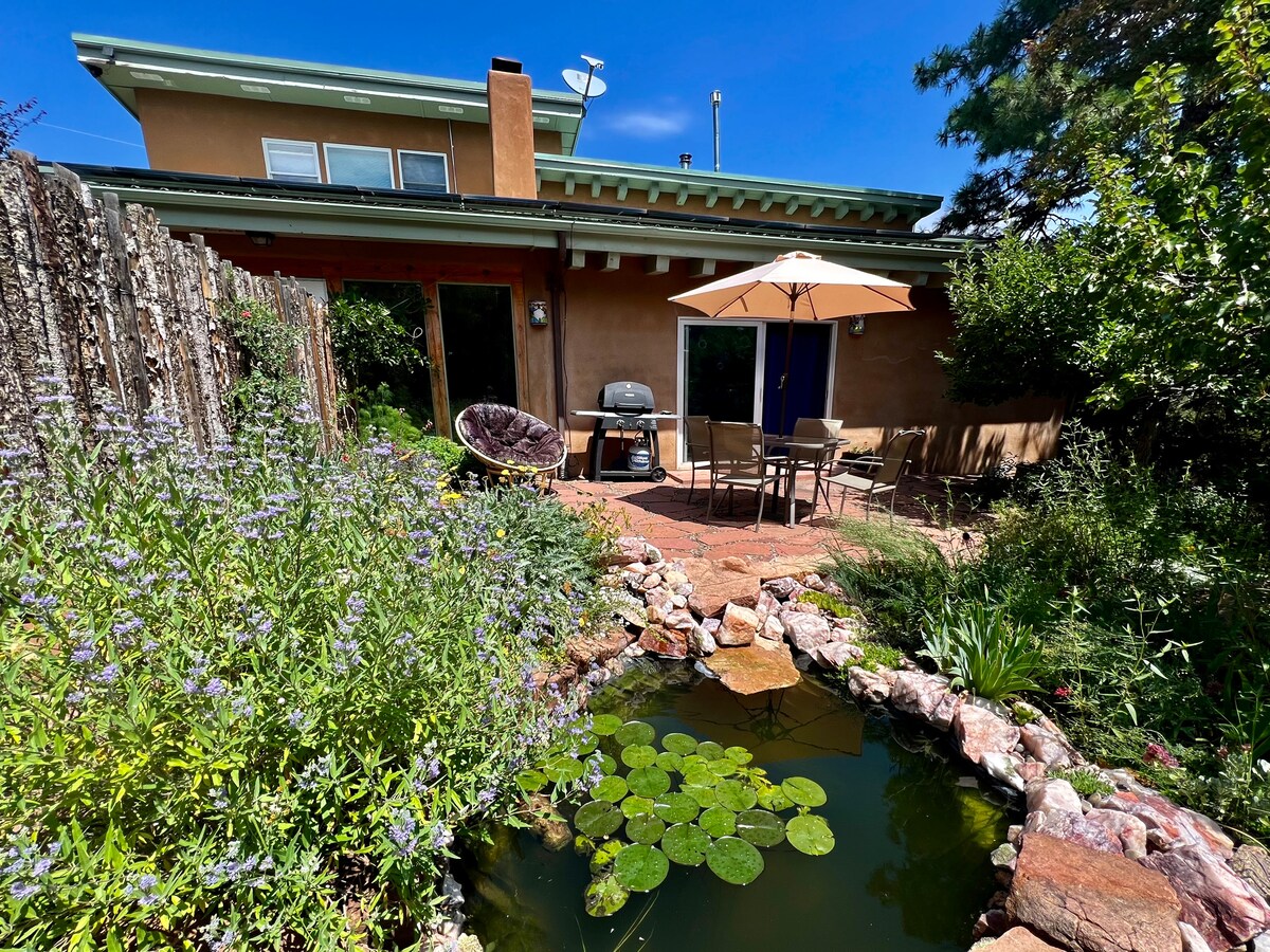 Santa Fe'nin 15 dakika dışında, tarihi Route 66 üzerinde, güzel bir ormanlık alanda büyüleyici, ferah, aydınlık ve temiz özel dubleks casita. Yürüyüş parkurları, aydınlatmalı çardak yemek alanı, güzel bahçeler, tavuklar, trampolin ve ateş çukuru, kapalı beş dönümlük alanda samimi bir şifa atmosferinin parçasıdır. Özel bir inziva, harika bir dinlenme molası veya Kuzey New Mexico'nun dikkate değer destinasyonlarından herhangi birine bir başlangıç noktası olarak mükemmeldir. Çocuklar hoş karşılanır! Ruhsat: # STRO-40055 İzin# 23-6109