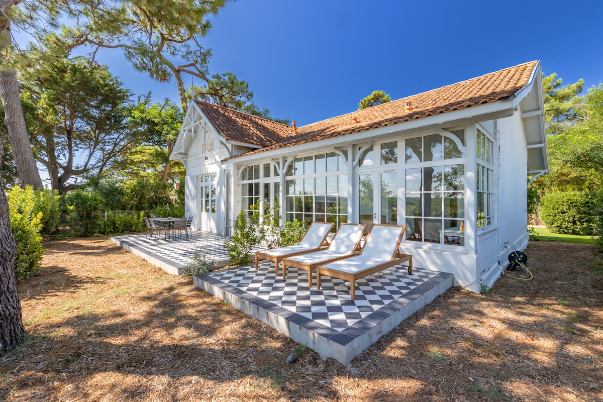 Bassin d'Arcachon'un panoramik manzarasına sahip kış şehrinin tepesinde 45 m2 daire. Eski bir evde sessizlik ve yeşil bir ortam, merkezden ve plajlardan 5 dakika uzaklıkta. Geniş ve zarif hacimler, özel otopark, mobilyalı balkon, queen boyutunda otel yatak takımı (160), yeni olanaklar, iyi adresler kitabı ve zarif detaylar... Konforunuz için her şeyi dikkatlice düşündük. Tek yapmanız gereken çantalarınızı bırakmak ve cennetimizde harika bir tatil geçirmek.