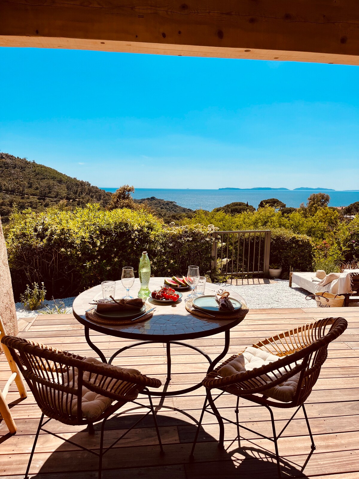 Cabane Theasis, Yunanca'da tefekkür manzarası. Akdeniz'in ve Altın Adalar'ın muhteşem, panoramik manzarasına sahip huzur cennetleri. Saint-Tropez'e 15 dakika mesafedeki Cabane Theasis, korunmuş bir manzaranın göbeğinde yer alıyor: Cap Lardier mülkü. Var sahilinin yeşil ciğerini oluşturan bu koruma alanı, 5 km'lik ince kumlu vahşi Gigaro plajının altında yer alıyor. Derelerle kaplı sahil yolu hemen önünüzde ve Pampelonne'un şenlikli plajları arabayla sadece birkaç dakika uzaklıktadır.