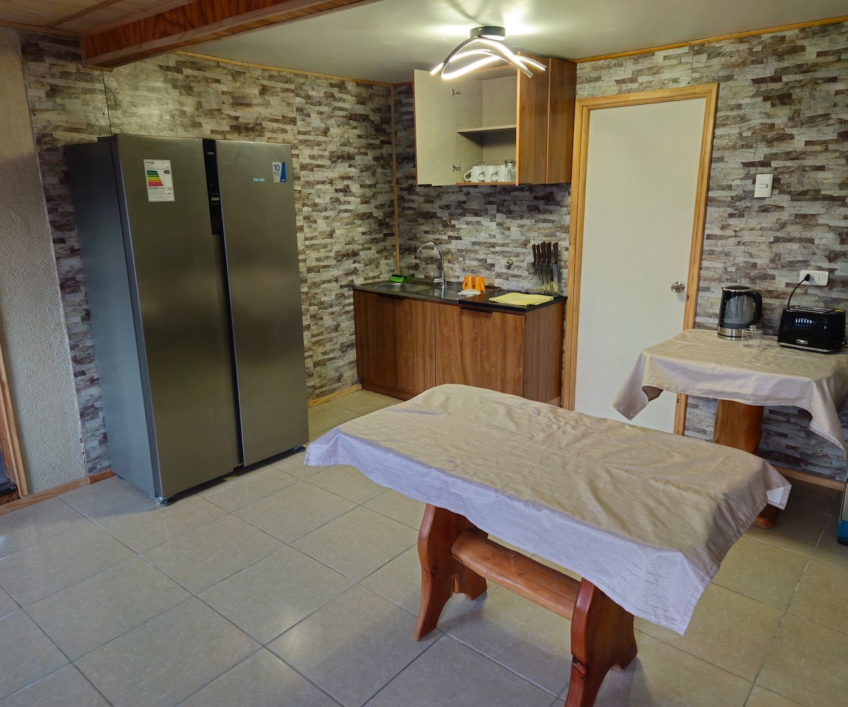 Departamento de interior pensado para el descanso en Cochrane. Cuenta con Wifi. No cuenta con TV Instalaciones nuevas, incluye lavadora. Aire acondicionado y refrigerador. Pensado para 3 personas con posibilidad de cama Marinera(Cama Nido) para un 4 huésped en caso de ser necesaria. Cuenta con 1 baño 1 dormitorio dividido por un biombo. 1 Cama matrimonial 1 cama marinera 1.5p + cama marinera 1 plaza Es una casa pareada pero completamente independiente.