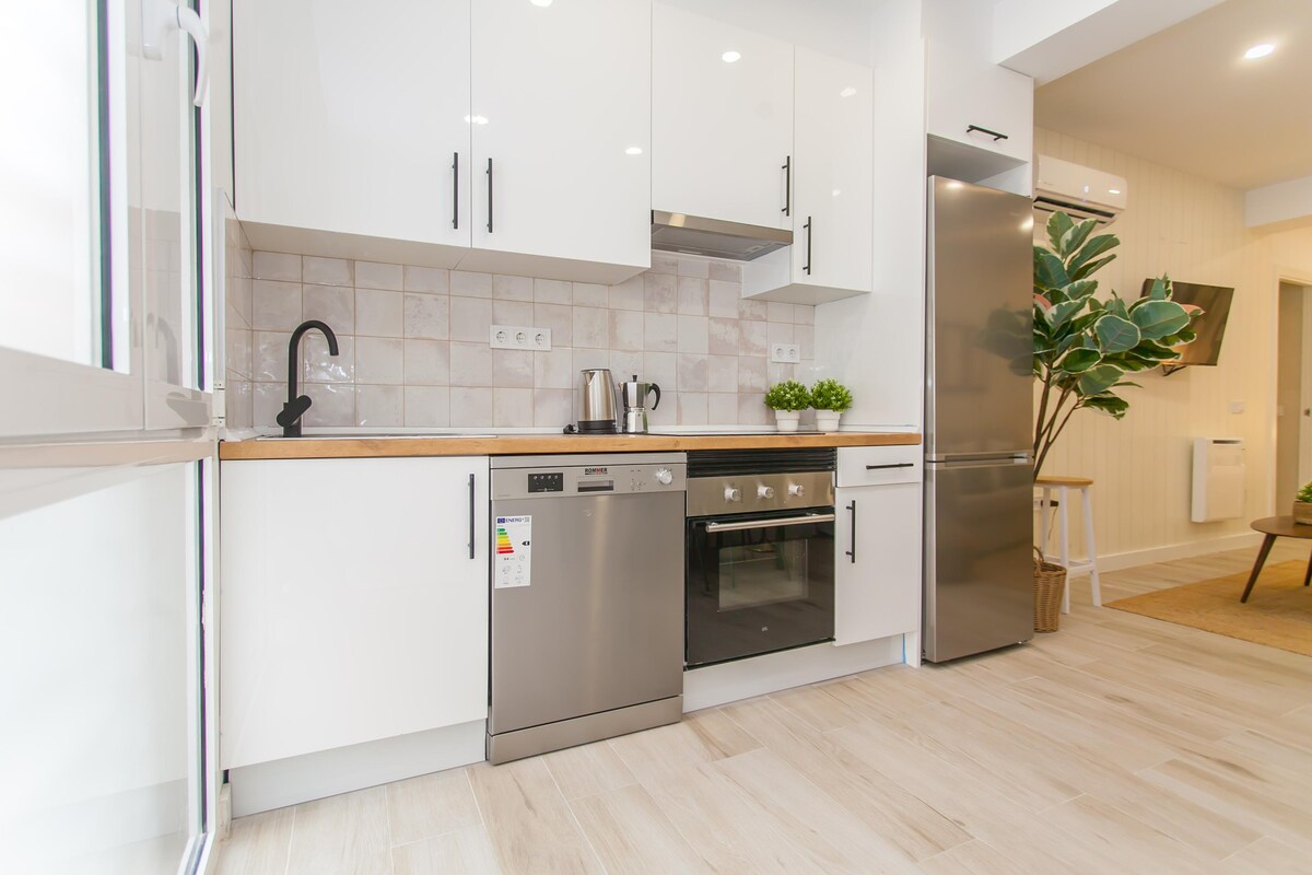 Madrid'in en büyük projeksiyonuna sahip semtlerden birinde yer alan bağımsız erişim, çok aydınlık bir daire, dikkatli bir tasarıma sahiptir, böylece başka hiçbir şey için endişelenmeden şehrin tadını çıkarabilirsiniz. Oturma odası, çekyat ve etrafında buluşmak için büyük bir masa vardır, mutfak tam donanımlıdır. Şehrimizi ve geniş bir banyoyu gezdikten sonra dinlenebilmeniz için rahat bir şilte seçtik. Ayrıca klima ve ısıtma sistemi ile 55inç TV seti kurduk.