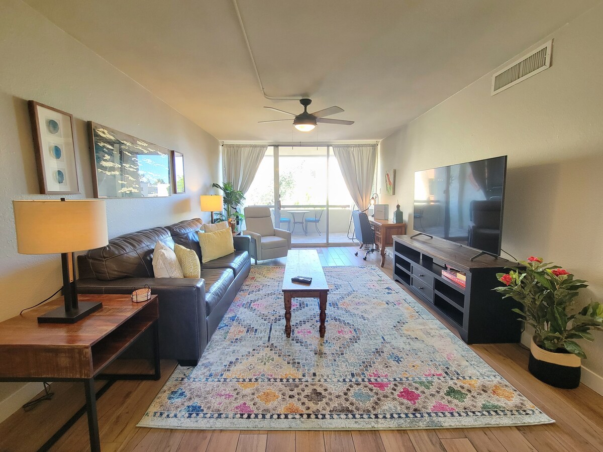 Mekân: Old Town Scottsdale'in göbeğindeki dinlendirici inzivanız Palm Paradise'a hoş geldiniz. Ekim 2024'te yenilenen bu daire, şık çöl bohem tasarımını evin tüm konforuyla harmanlayarak hem güzel hem de işlevsel bir alan yaratıyor. Şekerleme yapmak için mükemmel olan rahat yeşil kadife bölümlü koltukta gevşeyin veya Camelback Dağı'nın muhteşem gün batımı manzarasına tanık olmak için özel balkona çıkın. Büyük boy yatak ve kaliteli çarşafları olan sakin yatak odasına adım atın.