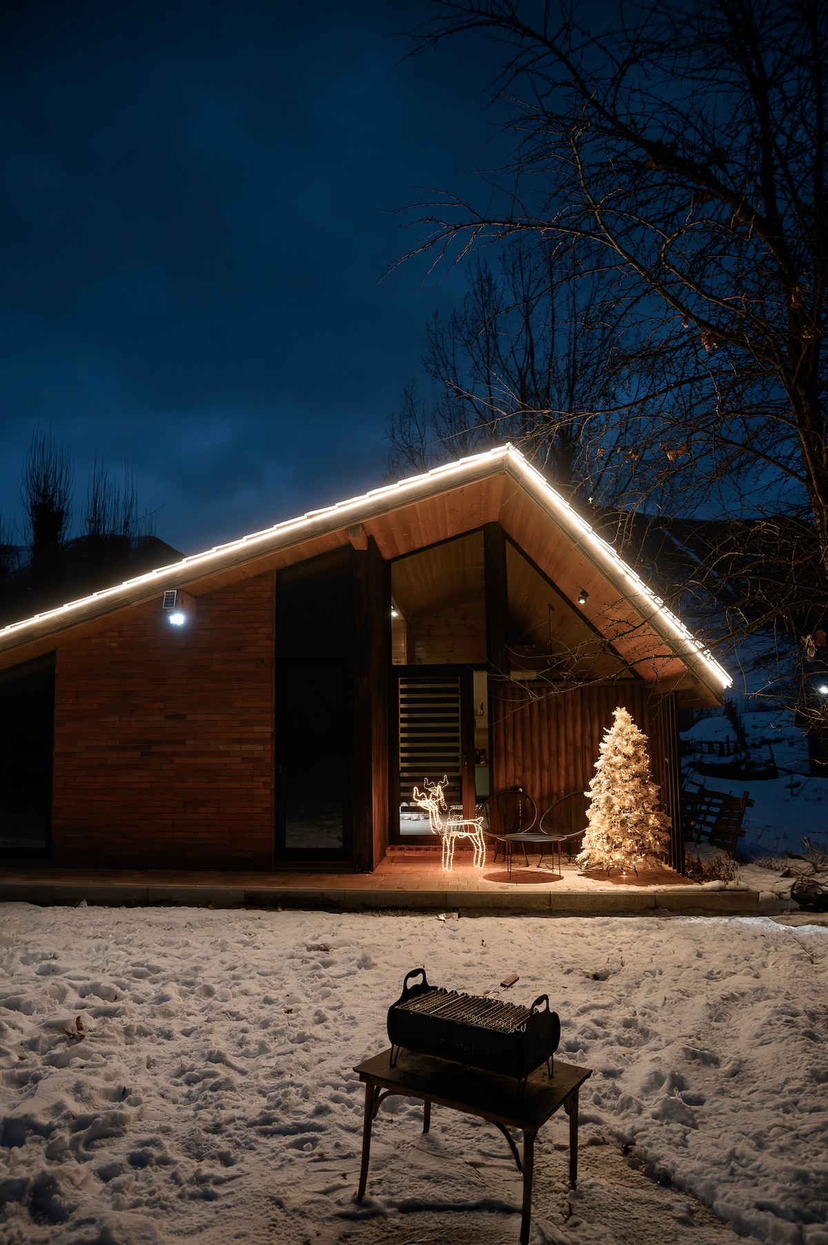 Cam çatılı ve Ushba manzaralı ahşap ev