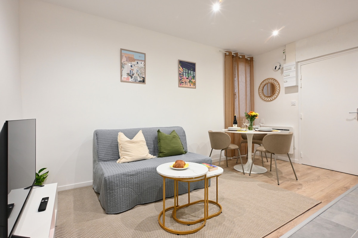 Profitez d'un logement élégant et central face aux Halles de Béziers, élues "plus beau marché de France 2025". Cet appartement de deux pièces climatisé et décoré par une architecte d'intérieur se trouve au troisième étage. La chambre est au calme et le séjour dispose d' un canapé convertible et de WC séparés. De plus, rénové en 2025, cet appartement est écologique et classé A+. Ce logement n’est pas adapté aux personnes à mobilité réduite. Logement pas adapté PMR