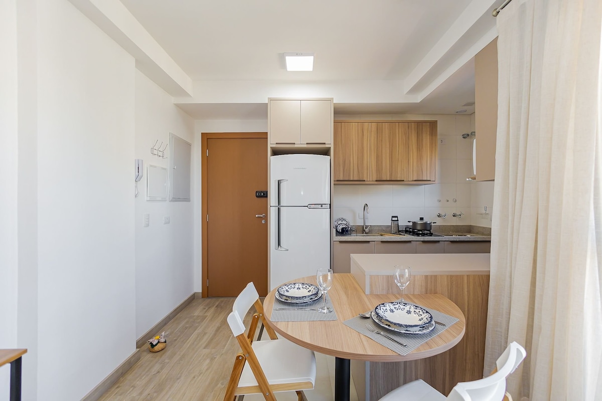 Şehrin göbeğinde bulunan güzel bir daire. Bohem semti Batel'in yakınındaki bu konumda, Shopping Crystal ve Shopping Pátio Batel, Rua 24 horas gibi birçok mağaza ve alışveriş merkezi bulunmaktadır. İki kişi için idealdir, oturma/yemek alanı, bir yatak odası, tam donanımlı bir banyo ve tam donanımlı bir mutfağı vardır. Mekanda ayrıca şunlar da vardır: kablosuz internet bağlantısı, akıllı TV, sıcak ve soğuk klima, mutfakta ve banyoda sıcak ve soğuk su. Yatak takımı ve banyo havlusu sağlıyoruz.