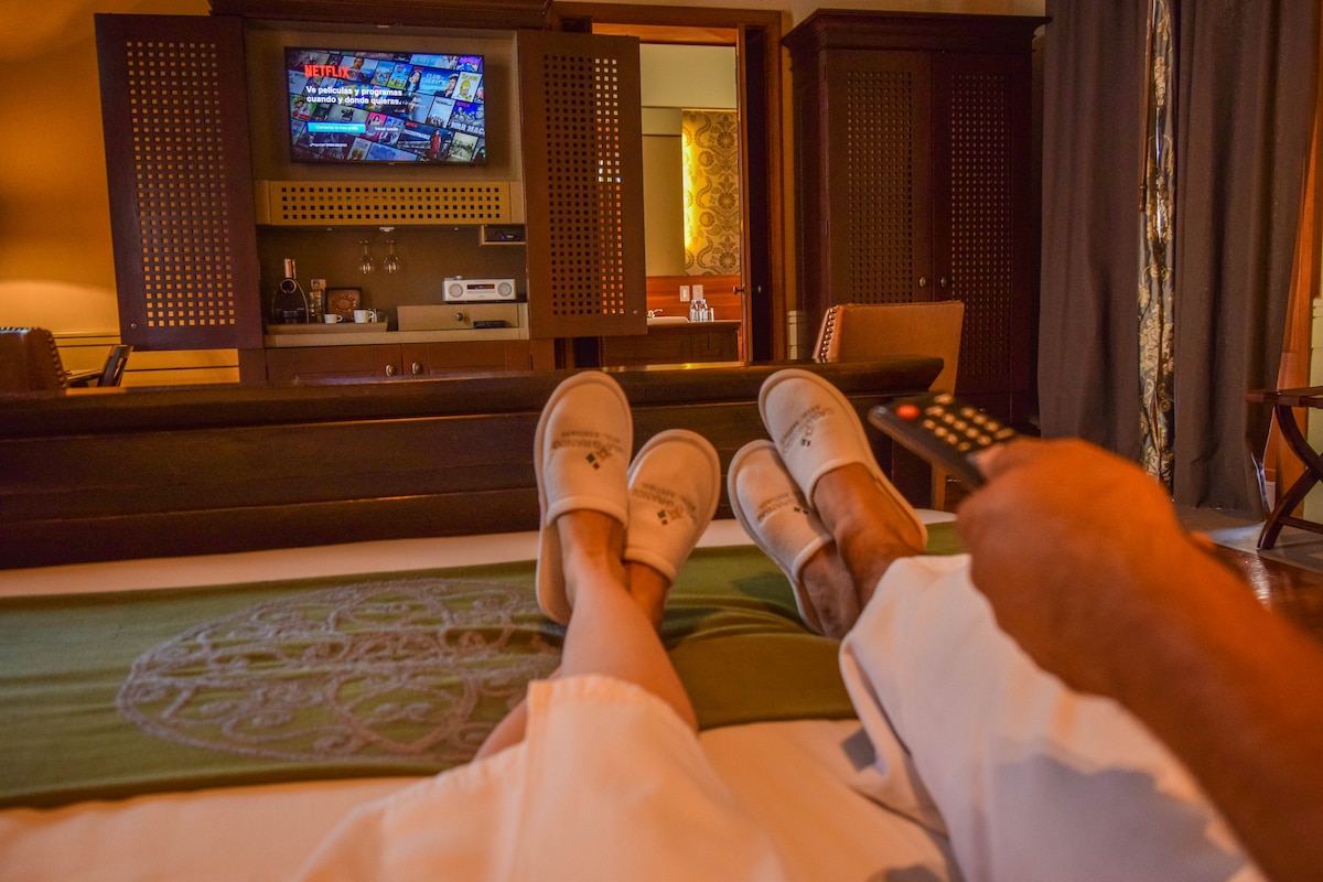 Comoda suite para dos adultos totalmente equipada con cafetera, minibar, aire acondicionado, WIFI, escritorio, elegancia y sofisticación para pasar una experiencia inolvidable.