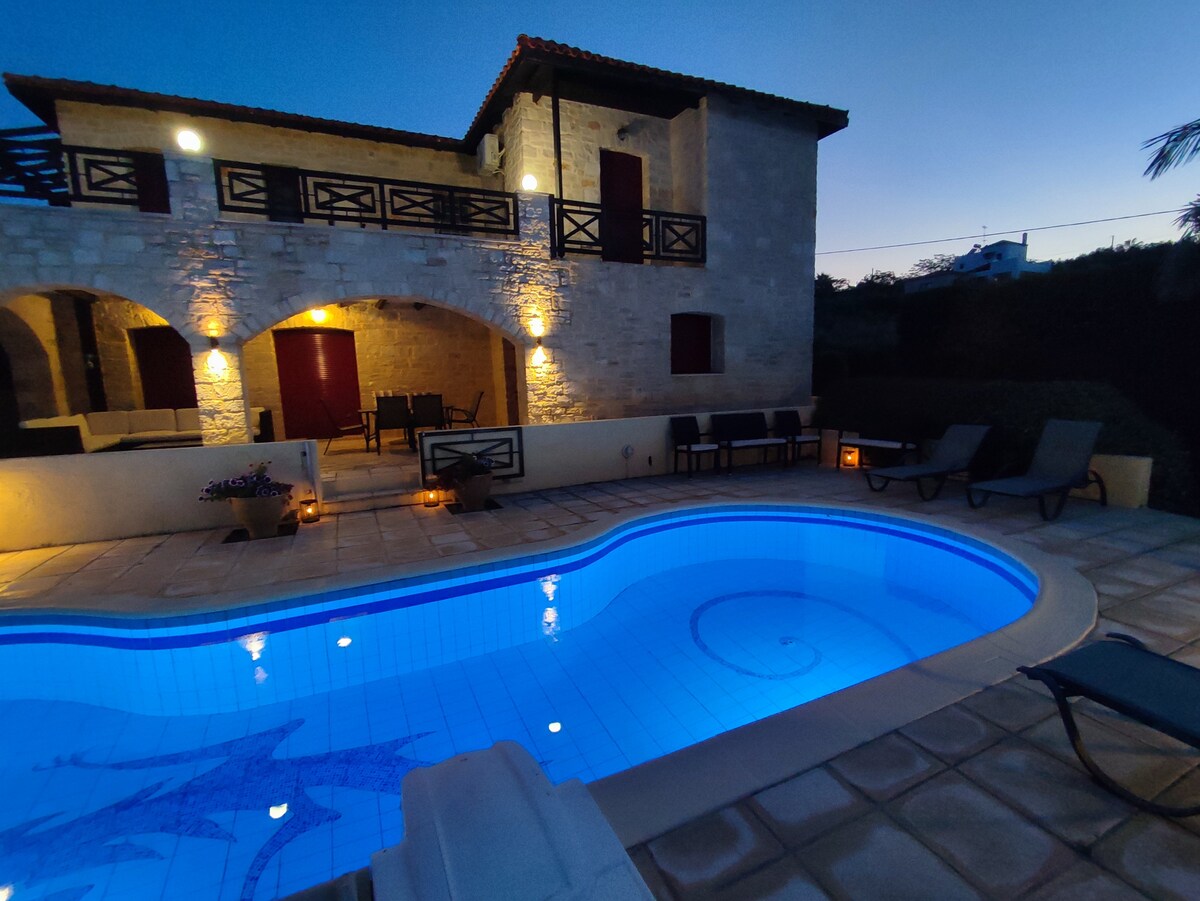 Sessiz ve tenha bir köyde, zeytinlikler ve koyun çiftlikleri arasında efsanevi İda Dağı'nın eteklerinde inşa edilmiş bu muhteşem villadan parlak Akdeniz güneşi altında dinlenin, muhteşem Girit manzarasının yanı sıra fantastik bir deniz manzarasının tadını çıkarın.