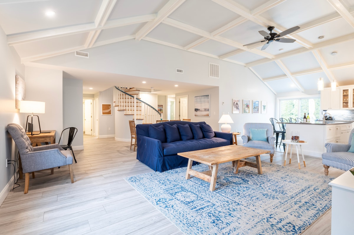 This 1800 square foot Ranch-style Condo with loft was built in 2018 and is set on a large nicely landscaped lot with plenty of room inside and out. It has 3 bedrooms and a loft and sleeps 9. It’s a 20-minute walk to the Edgartown village center, a 10-minute walk to Morning Glory Farm, and just a 10-minute drive to South Beach! All updated furnishings, beds, linens, appliances. Read our reviews! Immaculate!
