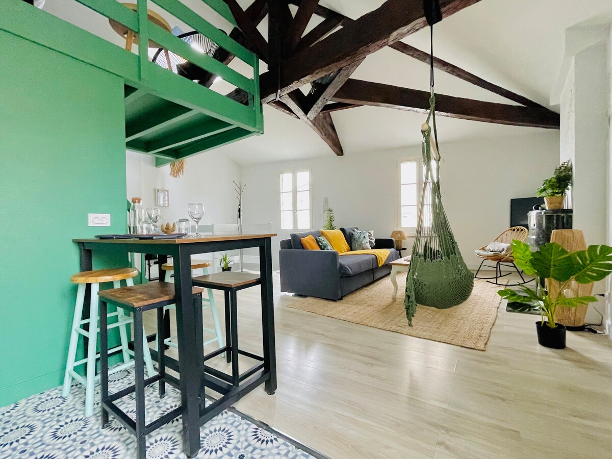 Angoulême'in göbeğinde jakuzili 70 m² çatı katı İki kişilik romantik bir kaçamak için mükemmel. ❤️ Olağanüstü bir an için özel jakuzi Bakımlı atmosfer, zarif dekorasyon ve samimi atmosfer. Tam donanımlı mutfak. Büyük çift kişilik yatağı olan yatak odası Büyük duşlu konforlu banyo. 📍 Yürüme mesafesinde eski kasaba, restoranlar ve dükkanlar. ⚠️ Sadece 2 kişilik konaklama – partiler ve toplantılar yasaktır. 🔐 Rezervasyon sırasında depozito talep edilir.