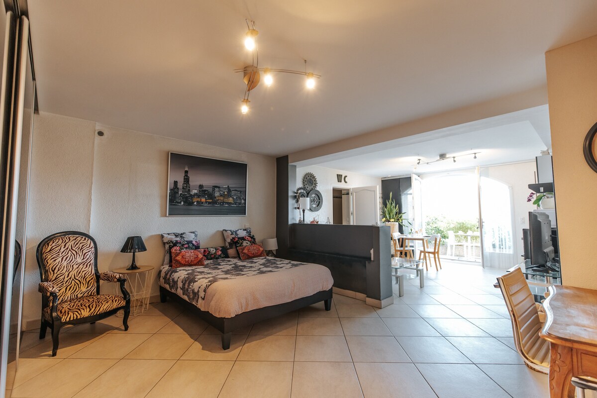 Annecy ve dağların panoramik manzarasına sahip evimizin zemin kat terasına sahip 42 m2 daire 12 m x 5 m tuzlu su havuzu şu tarihten itibaren açıktır: 1 Mayıs - 15 Ekim (başka bir Airbnb kiralaması ve ev sahipleriyle paylaşılacak). İstek üzerine havuz havluları Duşlu banyo, lavabo,tuvalet Tam donanımlı mutfak. Yatak takımı 160 x 200 cm Televizyon, kablosuz internet bağlantısı. Özel otopark Fırın, eczane ve markete 5 dakika yürüme mesafesinde sessiz bir semt Annecy'ye 15 dakikada 1 numaralı otobüs hattı