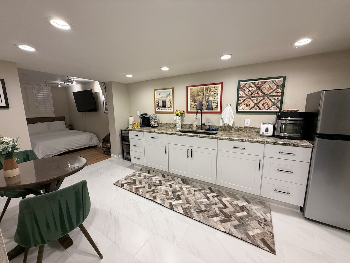 Denver'ın en çok aranan Platt Park semtinde bulunan bu güzel stüdyo dairede modern çiftlik evi cenneti sizi bekliyor. Beyaz badanalı, geniş kalaslı zeminler, çağdaş siyah pencere çerçeveleriyle vurgulanan son derece dingin bir atmosfer için zemin hazırlıyor. Koyu granit tezgahlar ve paslanmaz çelik aletlerle yan yana duran beyaz balıksırtı desenli duvar kaplaması, Denver şehrini keşfettikten sonra sabah kahvenizin veya akşam şarküterinin tadını çıkarmak için mükemmel bir yer olmasını sağlıyor.