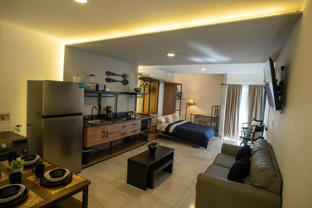 Torre Metro Loft'ta elit ev sahipliği deneyimini yaşayın. Şık tasarıma, açık alanlara ve muhteşem panoramik şehir manzarasına sahip modern bir çatı katının keyfini çıkarın. Chihuahua'da konfor, mahremiyet ve birinci sınıf konum arayan yöneticiler, çiftler veya seyahatseverler için mükemmeldir.
