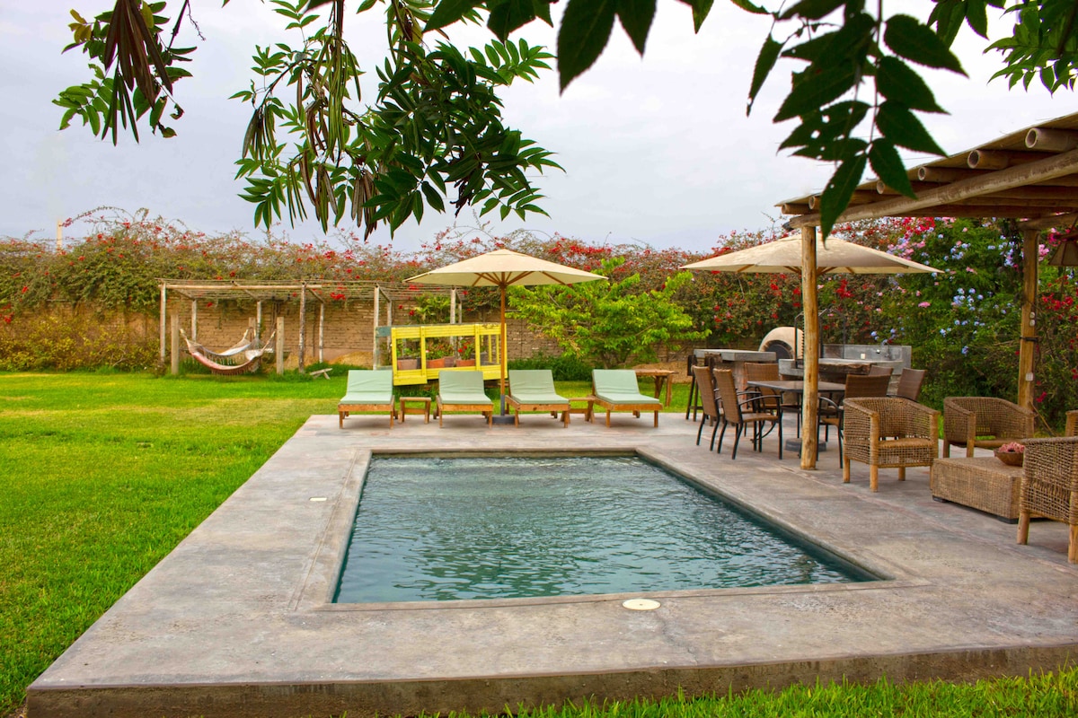 Condominio Fundo Hass'taki tüm olanaklara sahip kır evi. Lima'dan iki saat uzaklıktaki şehrin koşuşturmacasından uzak durun ve tamamen sessiz bir ortamda ve doğayla temas halinde birkaç gün geçirin. İkisi queen boy yataklı, ikisi çift kişilik yataklı, ikisi çift kişilik yataklı, özel banyolu dört oda. Aile olarak paylaşılacak sosyal alanlar, kamp için büyük bahçe, yüzme havuzu, teraslar, ızgara, bulaşık makinesi, çamaşır makinesi, kurutucu, büyük buzdolabı, asma kat, oturma odaları, kapalı otopark.