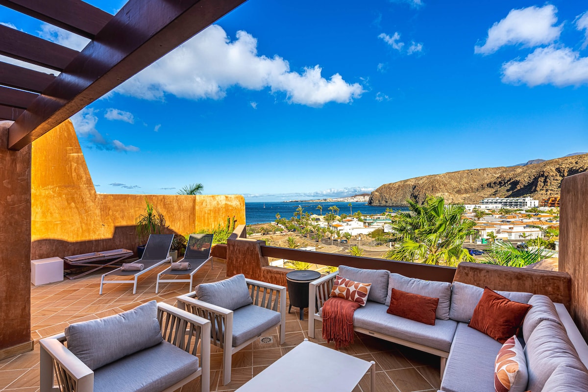 Deniz manzaralı, teraslı ve havuzlu Kanarya tarzı ev