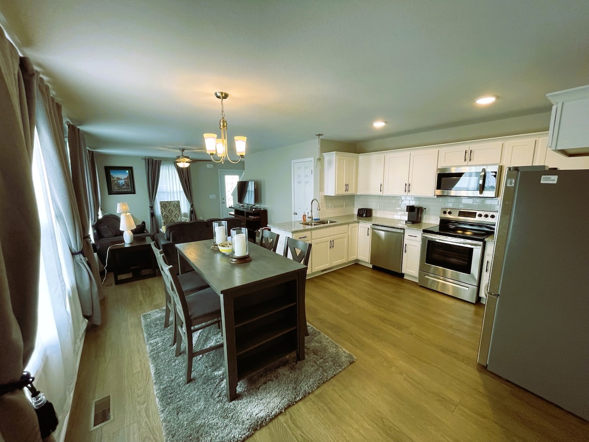 3 yatak odası ve 1,5 banyo. Ana yatak odasında king boy yatak, gömme dolap ve kendi tuvaleti vardır. Yedek odada çift kişilik yatak ve gömme dolap vardır. Fort Campbell, Downtown Clarksville ve Governor's Square Alışveriş Merkezi'ne dakikalar mesafesinde. Nashville Havalimanı'na 45 dakika. Semtteki Walmart Marketplace yürüme mesafesindedir. Yepyeni çamaşır makinesi, kurutucu ve buzdolabı. Yüksek hızlı kablosuz internet bağlantısı, Roku ve Nespresso kahveli büyük ekran TV'ler. Ormanlık bir cennete kadar uzanan dinlendirici veranda! 50 amper Tesla duvar şarj cihazı.
