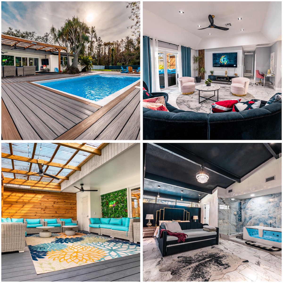 Welcome to the *BRAND NEW* Clearwater Stay and Play Resort in sunny Clearwater, FL! Sleeping up to 16 guests, and loaded with every amenity you can imagine! Book now while discounts lasts! *Full-size Pickleball / Basketball court *Game Room with Pool table, Foosball table, 2-person Arcade table and 85” Smart TV *3-Hole Putt Putt Course *Large outdoor seating and dining areas *A playhouse for the little members of your group * Massive Heated Pool * Hot Tub * Fire Pit