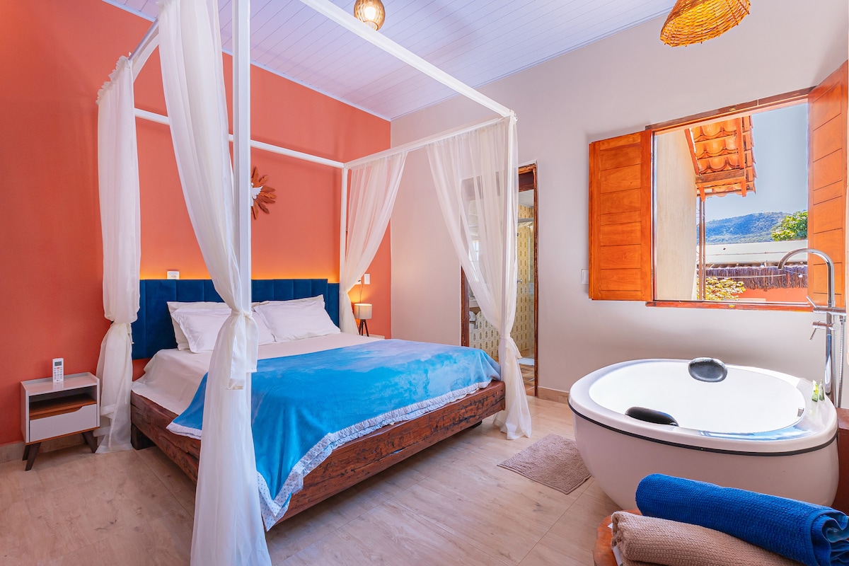Somos o Canto dos Pireneus Hospedaria, refúgio com seis chalés, a cerca de 40 minutos de Piri (15 km de estrada de terra). Na categoria deste anúncio, temos duas suítes com pequenas diferenças de localização da propriedade e de disposição da banheira. Inclui cama king size, enxoval 400 fios, toalhas Trussardi, amenities L’Occitane au Brésil, café da manhã entregue em cesta, acesso a cachoeira contemplativa. Durante a semana, há obra da recepção em andamento, localizada a 30m.