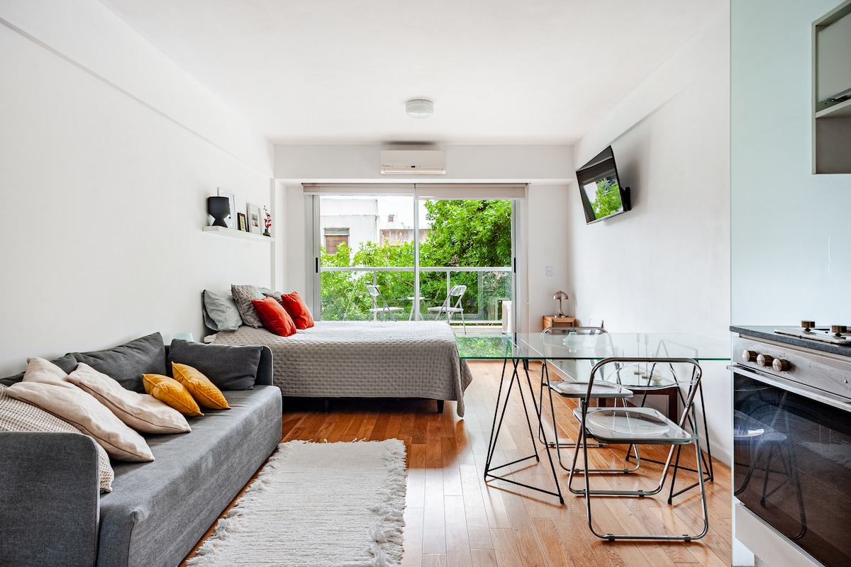 Bu ferah ve sakin alanda endişelerinizi unutun. 1 veya 2 kişilik aydınlık ve modern tek ortam. Palermo ve Chacarita'ya çok yakın Villa Crespo'da, barlar, restoranlar, outlet alanı, süpermarketler ve parkların bulunduğu çok sakin ve yerleşim alanında bulunmaktadır. Şehrin her yerine ulaşım için birçok ulaşım aracı mevcuttur (metro hattı B, Metrobus ve bisiklet yolları). Milonga ve tango akademilerine ve Movistar Arena'ya yakın