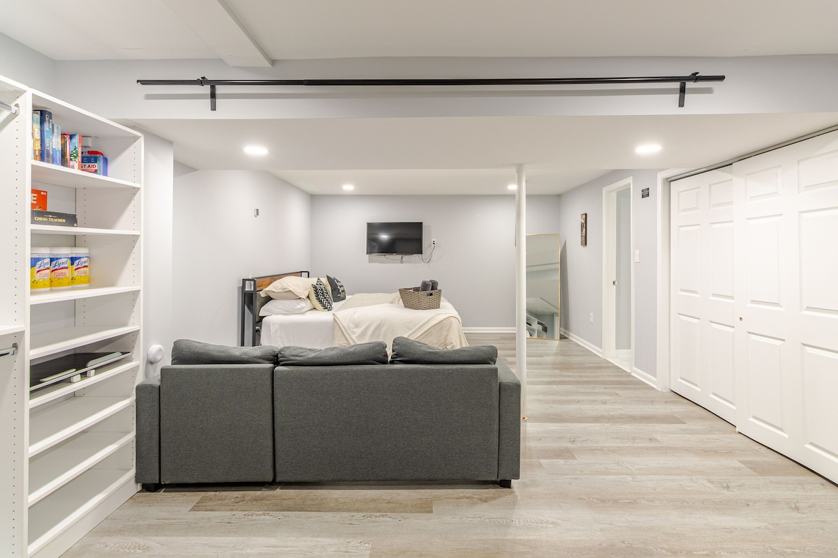 İki yıllık bir yenileme projesinden sonra en son tasarımımı paylaşmaktan memnuniyet duyuyorum! Bu bitmiş bodrum katı tamamen yenilenmiş ve birçok harika olanakla tasarlanmıştır! Güvenli otopark, özel giriş, yepyeni küçük mutfak alanı ve özel banyo, özel çalışma alanı, doğal aydınlatma için BİRÇOK pencere, yatak odasında karartma perdesi ve tavanın tamamı ses geçirmez! Daha fazla konfor ve keyif için yatak odasında ekstra ses yalıtımı kullanılmıştır!