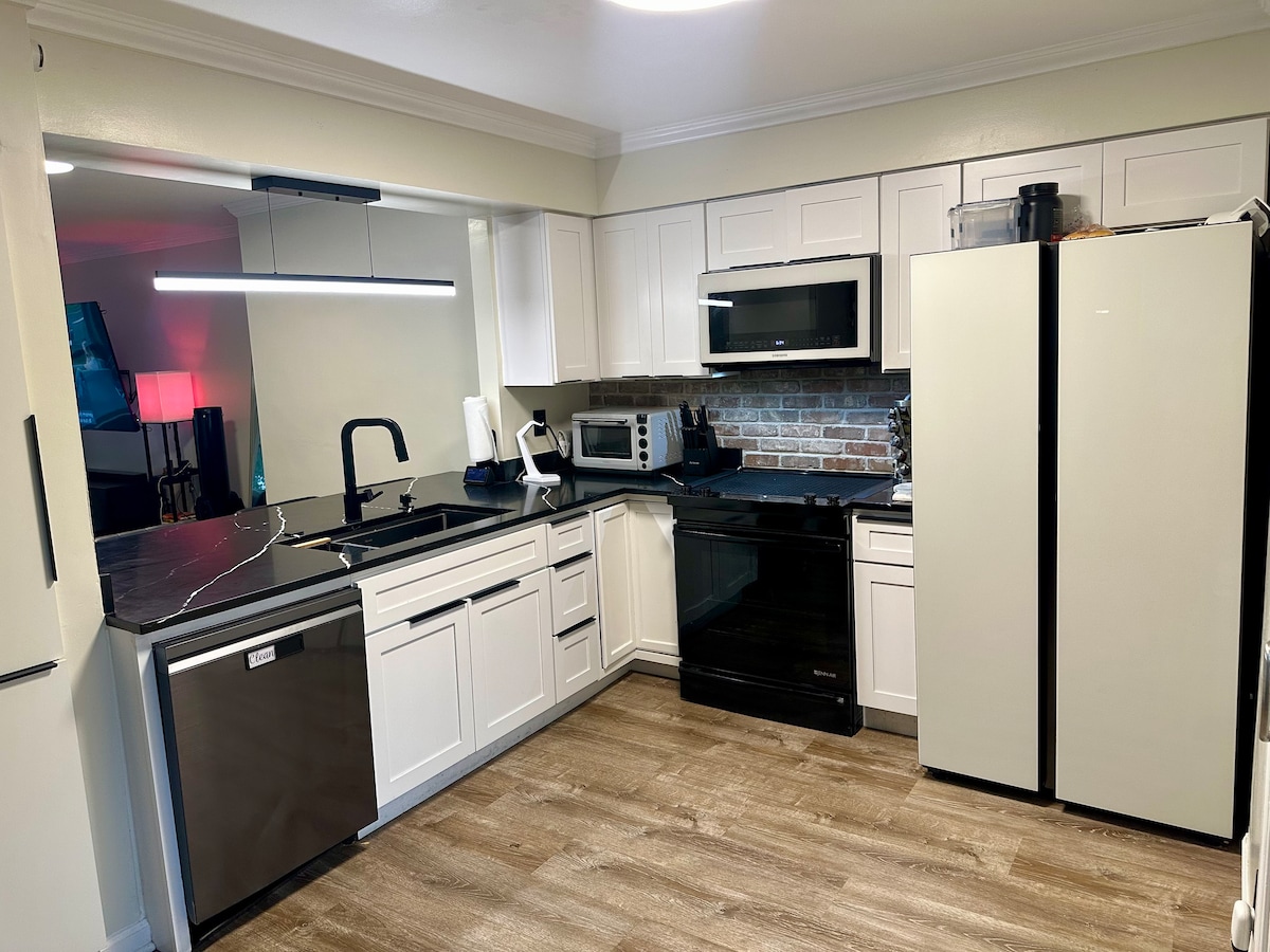 Kendi girişi ve kendi kendine giriş olanağı olan geniş ve özel bir bodrum dairesine hoş geldiniz. King boy yataklı bir yatak odası, 85 inç akıllı TV, yumuşak köşe koltuk, özel tuvalet, banyo ve küçük mutfağı aynı mekânda bulunan bir yerde misafirlerinizle rahat edin. Olanakların hiçbiri paylaşılmaz. Tam donanımlı küçük mutfakta yemek pişirmek ve yemeklerinizi ısıtmak için ihtiyacınız olan her şey vardır. Misafir süiti, ev sahibinin yaşadığı daha büyük bir evin parçası olan bodrum katının tamamıdır.