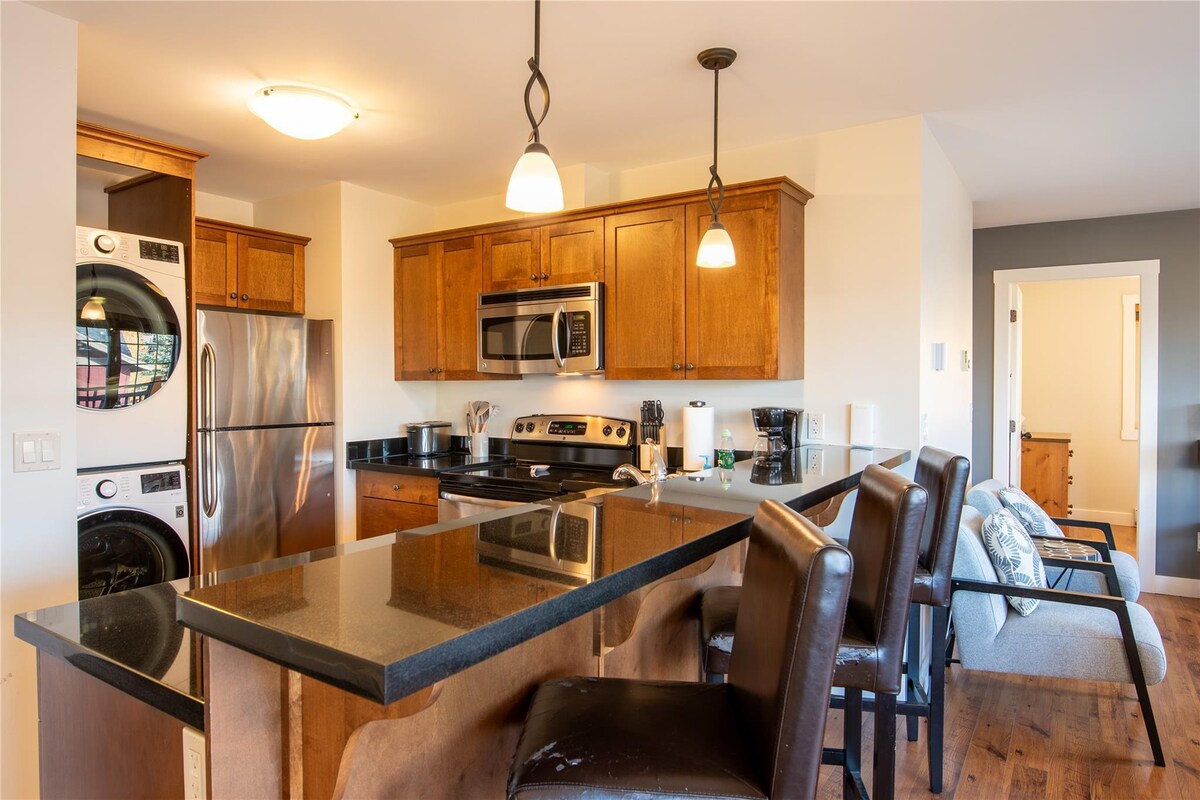 Revelstoke Mountain Resort'a ve şehir merkezine sadece 5 dakika mesafede 2 yatak odalı modern site içi konut. Konumu rahat bir alışveriş merkezinin bulunduğu sakin bir semtte, yakınlarda spa, spor salonu, pilates stüdyosu, market, içki dükkanı, restoran, kreş ve fırın var. Tam donanımlı bir mutfağın, daire içinde çamaşır yıkama olanaklarının ve yeraltı otoparkının keyfini çıkarın. Dağ manzaralı geniş verandada dinlenin veya keşifle geçen bir günün ardından iç mekândaki büyük kanepede rahatlayın. Revelstoke'taki konaklamanız için konforlu, konumu iyi bir merkez.