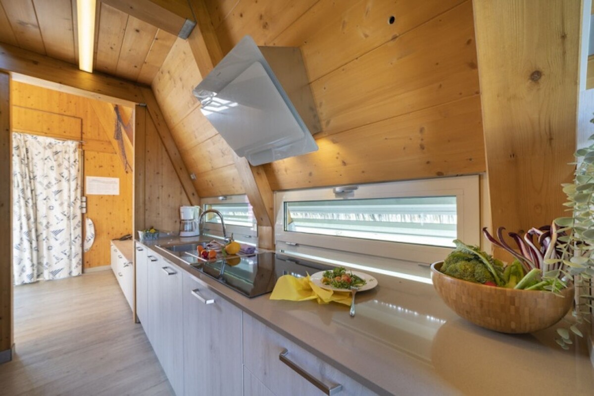 Yaklaşık 32 metrekarelik bir alana sahip yepyeni mobil evler en fazla 5 kişiyi ağırlayabilir. Modern ve konforlu bir tarzda döşenmiştir, masa ve sandalyelerle tamamlanmış bir mutfak, çok rahat bir çekyat, dondurucu ve mikrodalga fırın ile tamamlanmış sütunlu bir buzdolabı ile donatılmıştır. Uyku alanı, özel banyolu çift kişilik yataklı iki yatak odası ve iki tek kişilik yataklı bir yatak odasından oluşmaktadır. Konaklama yerinin ayrıca yaşam alanında duş, tuvalet ve lavabo ile tamamlanmış bir banyosu vardır.