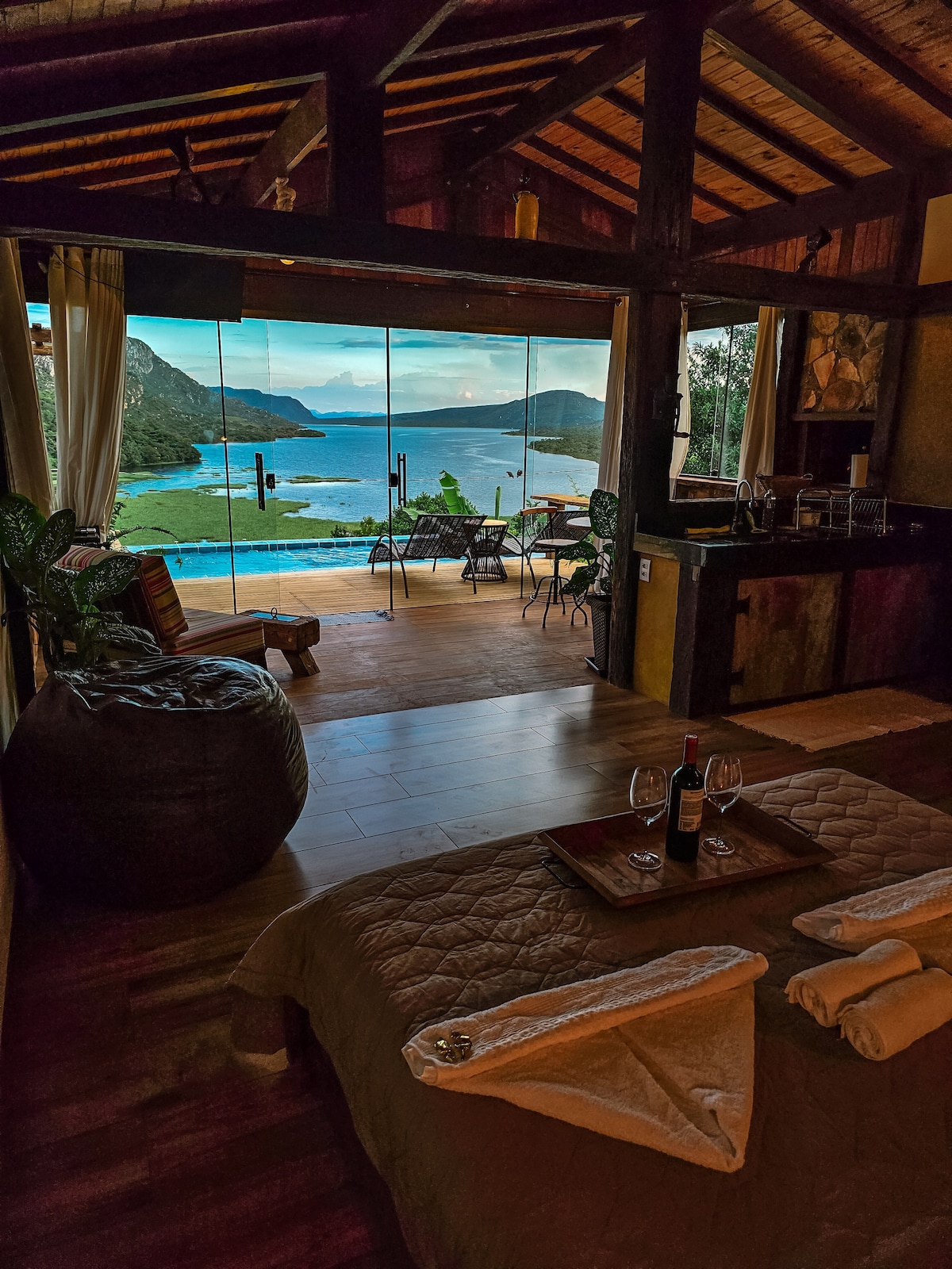 @amanhecerdohorizonte King yataklı, balkonlu ve jakuzili (kapasite 4 kişi) cam kapalı 1 süit, tüm mevsimler için idealdir. 1 süit, king yataklı. Çift kişilik ve tek kişilik yataklı 1 süit. Güverte manzaralı havuz p/ Pico do Breu, Rapel Paraíso Şelalesi ve Ana Göl. Gazlı ısıtmalı duş, barbekü, hamak, duş, kablosuz internet bağlantısı, TV, yatak takımı,banyo, temizlik ürünleri. Donanımlı mutfak, Air Fryer, mikrodalga fırın, bardak, fincan, fincan, fincan, kahve makinesi 3 Hearts (kapsülünüzü alın)
