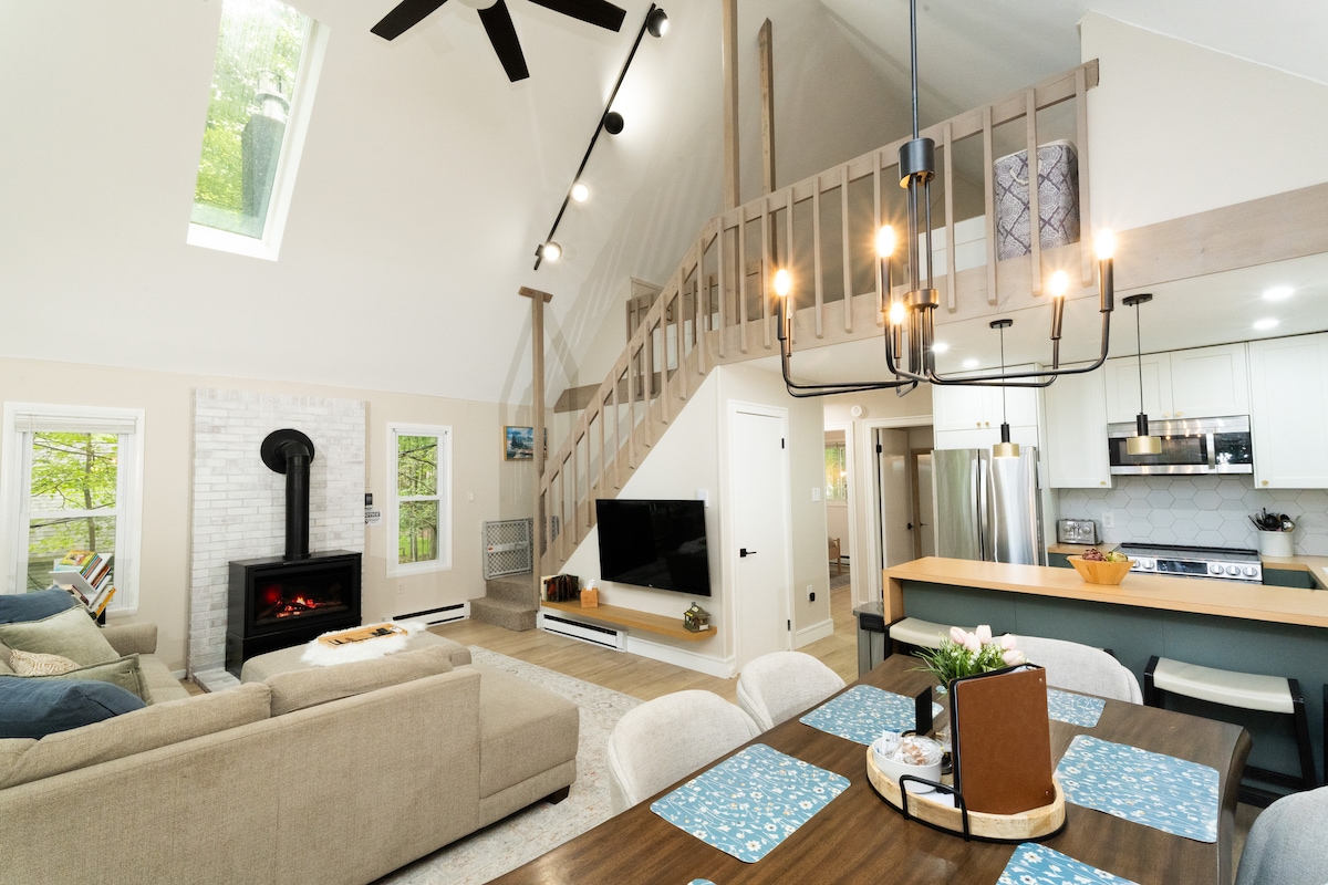Bu modern Poconos A-çerçevesi, rustik cazibeyi çağdaş konforla harmanlıyor. Huzurlu orman manzaralarıyla çevrili bu evde geniş bir teras, sıcak bir ateş çukuru ve yüksek pencereleri olan şık bir iç mekan bulunuyor. Çiftler, aileler veya arkadaşlar için mükemmeldir, yıl boyunca macera yürüyüşü, şelaleler, kayak gibi aktiviteler sadece birkaç dakika uzaklıktadır. Rahatlayın, yeniden bağlanın ve yıldızların altında özel bir inzivanın tadını çıkarın.