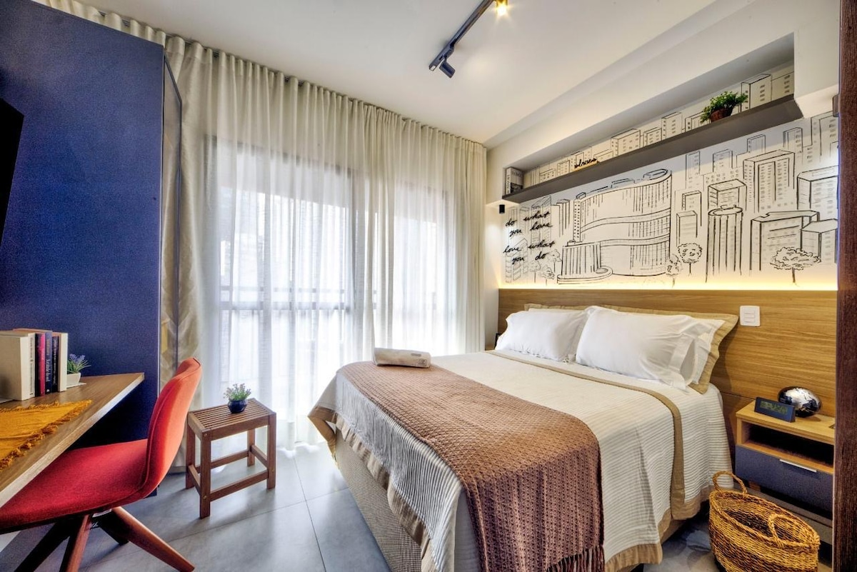ATENÇÃO: Para utilizar o facility do estacionamento deve-se avisar com antecedência. Consulte a entrada do local nas fotos. Loft moderno bem decorado com vista urbana linda de São Paulo. Oferece cama Queen com pillowtop de 10 cm, TV de 50 polegadas, e ambiente iluminado pelo sol. A cozinha é equipada com utensílios de qualidade e inclui mesa de jantar e bancada de trabalho. O armário tem um bom espaço de armazenamento e o apartamento conta com ar-condicionado para conforto o ano todo.