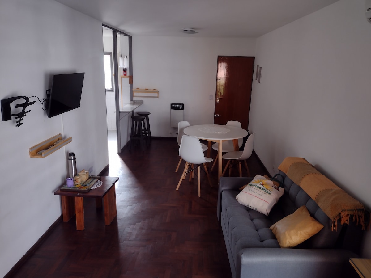 El departamento, situado en la ciudad de Cordoba, Argentina, es muy luminoso. Está ubicado en el 2º piso del edificio, es interno, por lo que la tranquilidad está garantizada. Posee un dormitorio con sommier de dos plazas (1,40 m), con aire acondicionado split frio calor, smart tv de 32", directv. Cocina comedor totalmente equipada con microondas, pava eléctrica, tostadora, frigobar con congelador y todos los utensilios. Plancha con tabla de planchar de apoyo. calefactor en la cocina comedor
