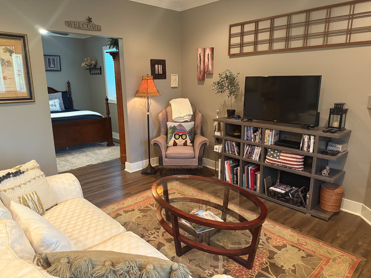 You will relax and recharge in the peaceful and private cottage - it's so private some of the neighbors don't even know it's there! You will love the: --Two large bedrooms offer a king sized bed & a queen sized bed --Full kitchen with fridge, stove, microwave, keurig & dishwasher --Full sized washer and dryer in the unit --Wifi --TV w/netflix, Hulu & cable --Wood floors --Comfy living room --Outside patio area --Did we mention it's private?