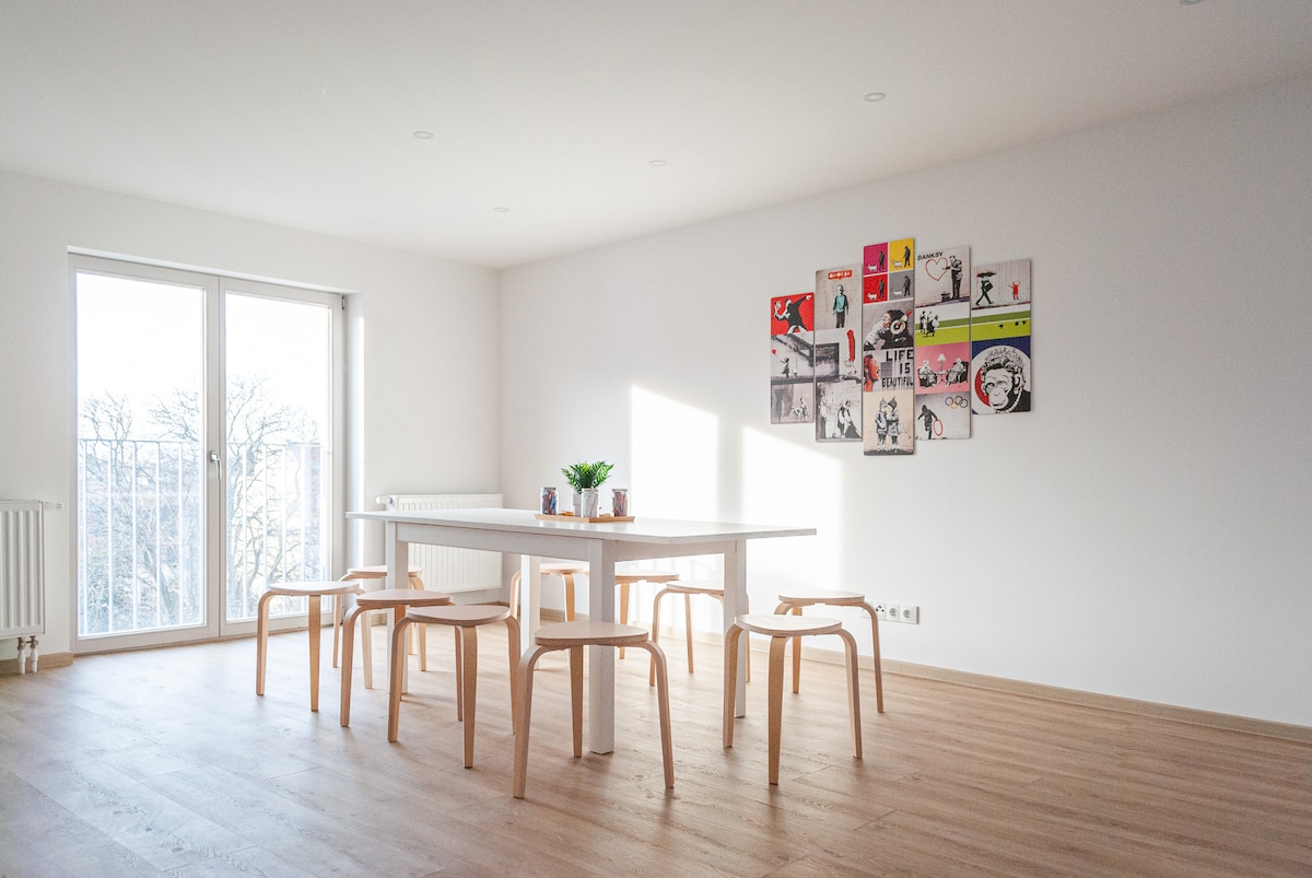 Ana tren istasyonuna sadece bir yürüyüş mesafesinde olan bu yeni ve ferah daireye hoş geldiniz. 5 oda ve büyük bir mutfak - oturma odası (2 kişilik çekyat dahil) ile konfor ve rahatlık için ideal bir alan sunar. 5 odada 10 kişi kalabilir. Dairenin öne çıkanlarından biri terasa çıkan merdivendir. Burada güneşin tadını çıkarabilir,rahatlayabilir ve şehir manzarasını seyredebilirsiniz. Dairenin konumu da iyi toplu taşıma bağlantıları sunmaktadır.